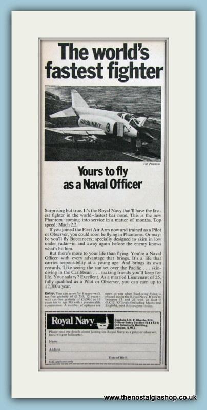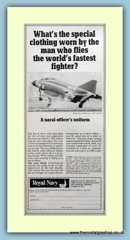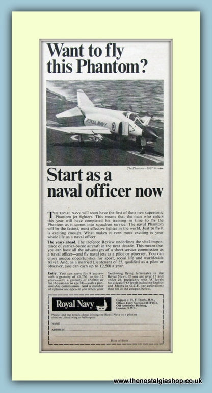 The Phantom Jet, Royal Navy. Start as a Naval Officer. Set of 3 Classic original adverts 1966 & 1967. Price is for all 3 adverts. Each is presented in cream bevel cut mount with backing card and clear bag. Each is ready to fit in 14.5 x 7 inch frame. Want them framing? If so, buy this then go to Frames Available Category. Click to buy on the suitable frame(s) and we will do the rest. All our adverts, unless clearly stated are Originals from the date shown They make excellent pieces of wall art and stunning gifts. Many are rare and hard to find and once sold, may not be replaced. Remember you are buying a piece of history. Website watermark is not on original.