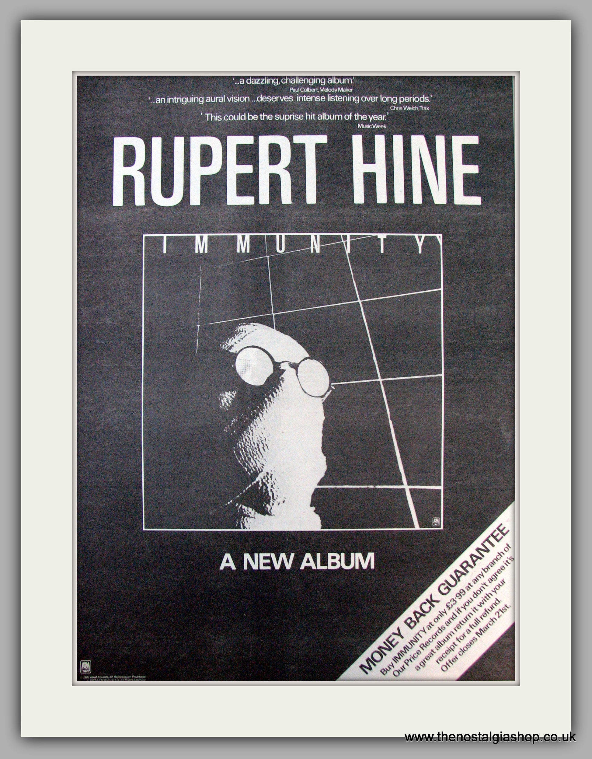 Rupert Hine. Immunity. Vintage Advert 1981 (ref AD9860). Presented and supplied in a cream bevel cut mount with backing card and clear bag. Ready to fit in a 20x16 inch frame. The mounted advert will be posted via courier and well packed - protected with a sheet of hardboard to keep it rigid. Any questions or enquiries, please get in touch, we are here to help! All our adverts, unless clearly stated are originals from the date shown. They make excellent pieces of wall art and stunning gifts. Many are rare and hard to find and once sold, may not be replaced. Remember you are buying a piece of history. Website watermark is not on original.