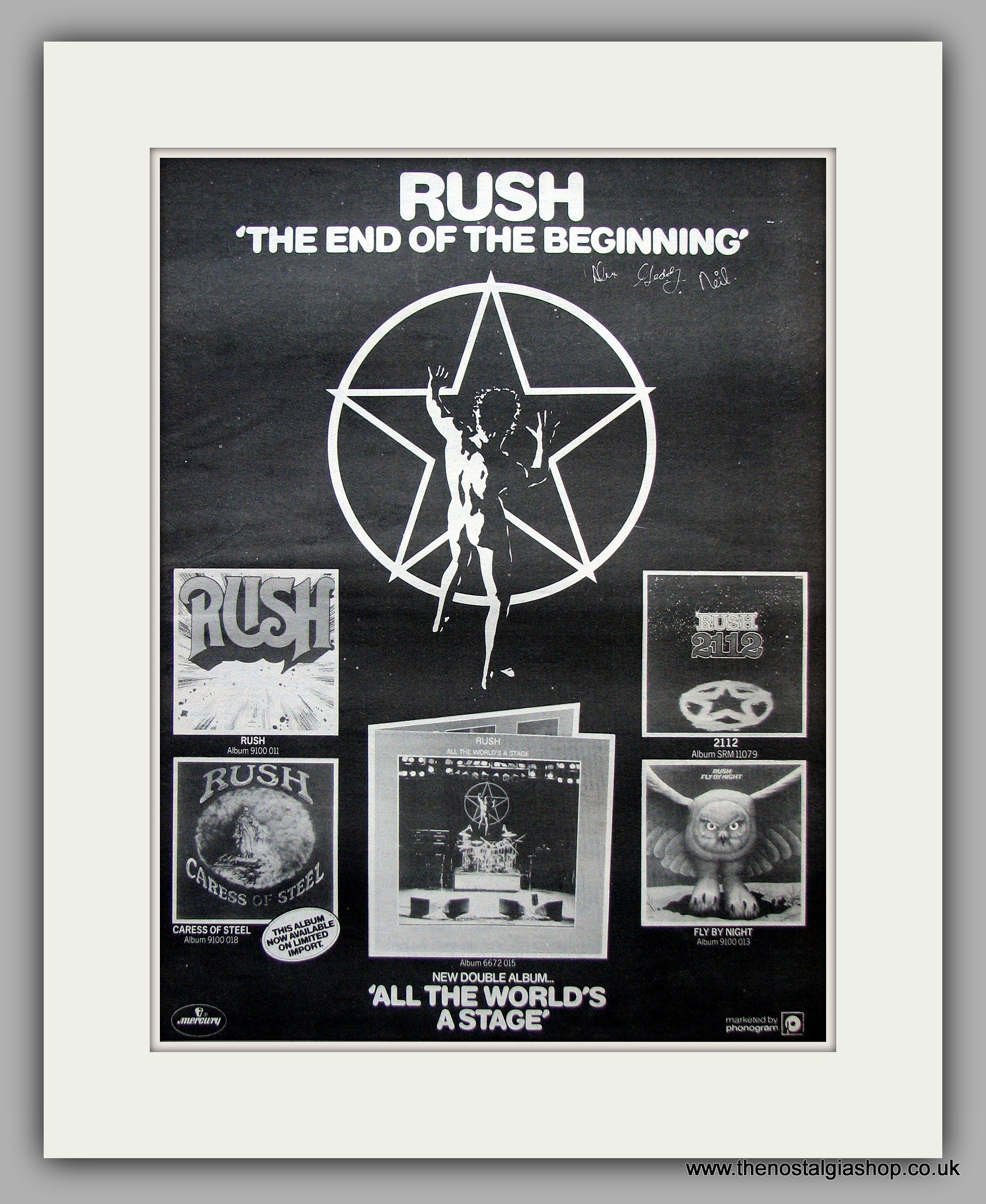 Rush. The End of The Beginning. Original Vintage Advert 1977 (ref AD10764). Presented and supplied in a cream bevel cut mount with backing card and clear bag. Ready to fit in a 20x16 inch frame. The mounted advert will be posted via courier and well packed - protected with a sheet of hardboard to keep it rigid. Any questions or enquiries, please get in touch, we are here to help! All our adverts, unless clearly stated are originals from the date shown. They make excellent pieces of wall art and stunning gifts. Many are rare and hard to find and once sold, may not be replaced. Remember you are buying a piece of history. Website watermark is not on original.