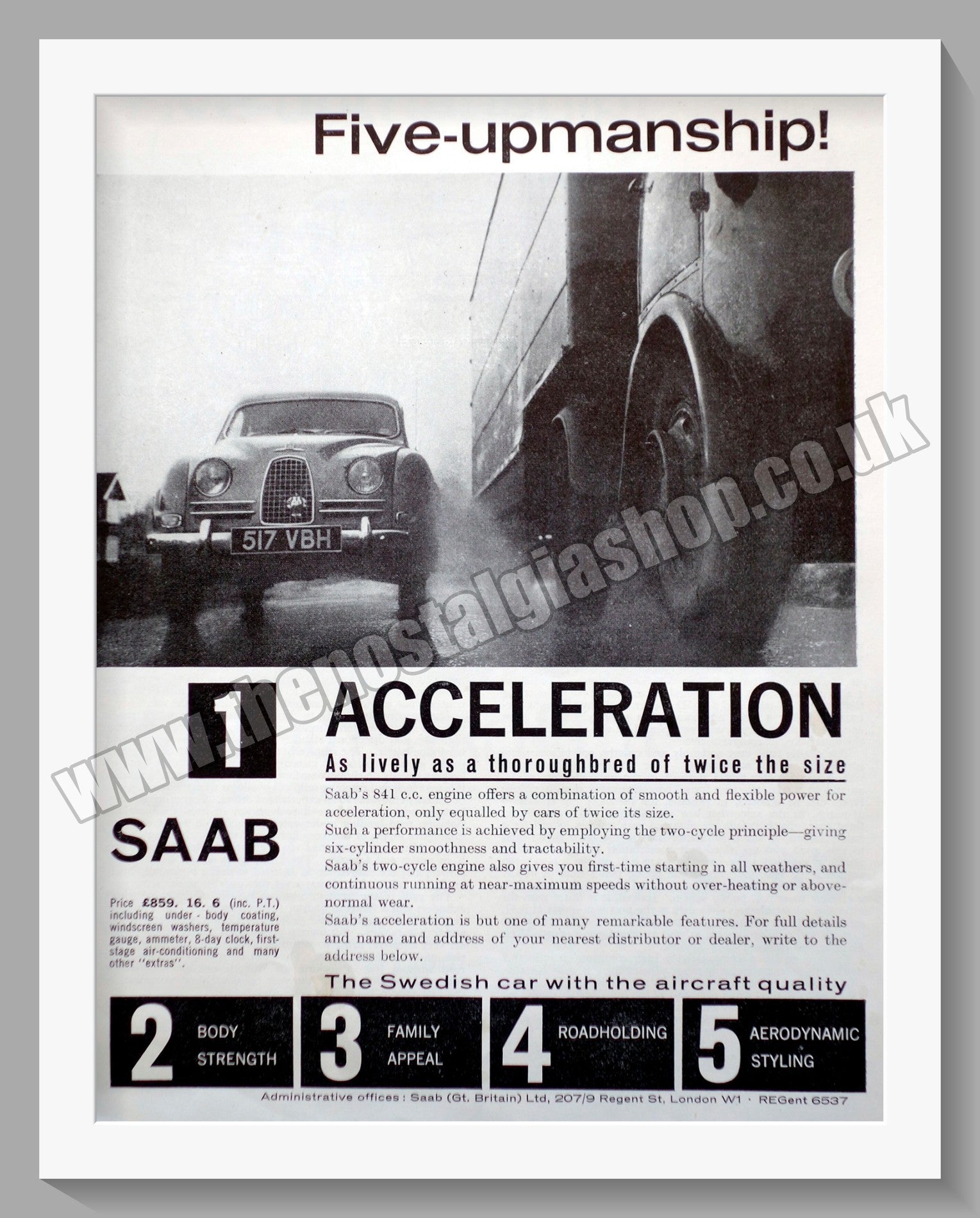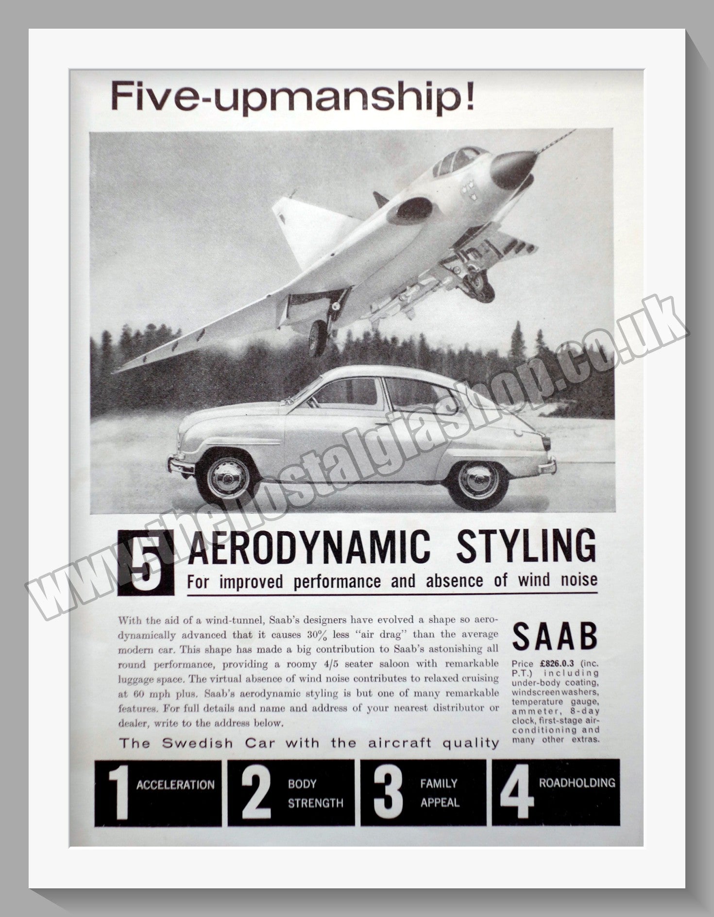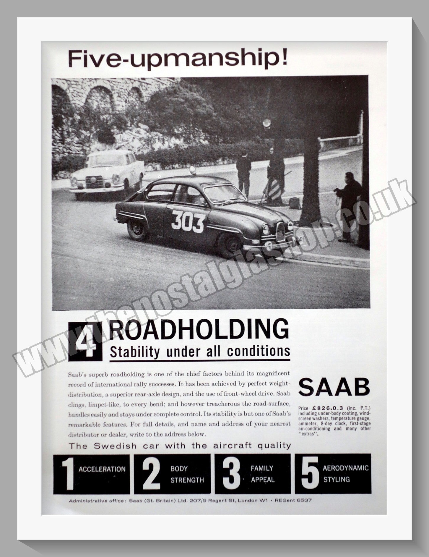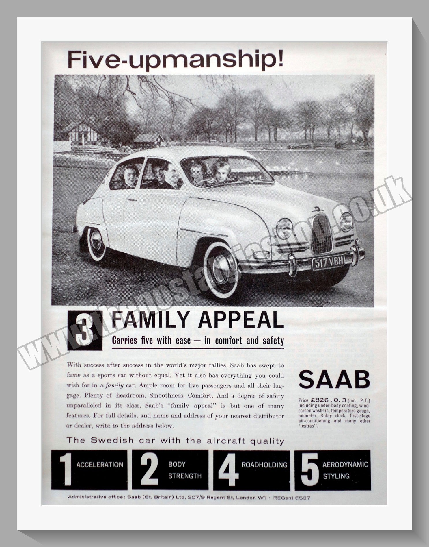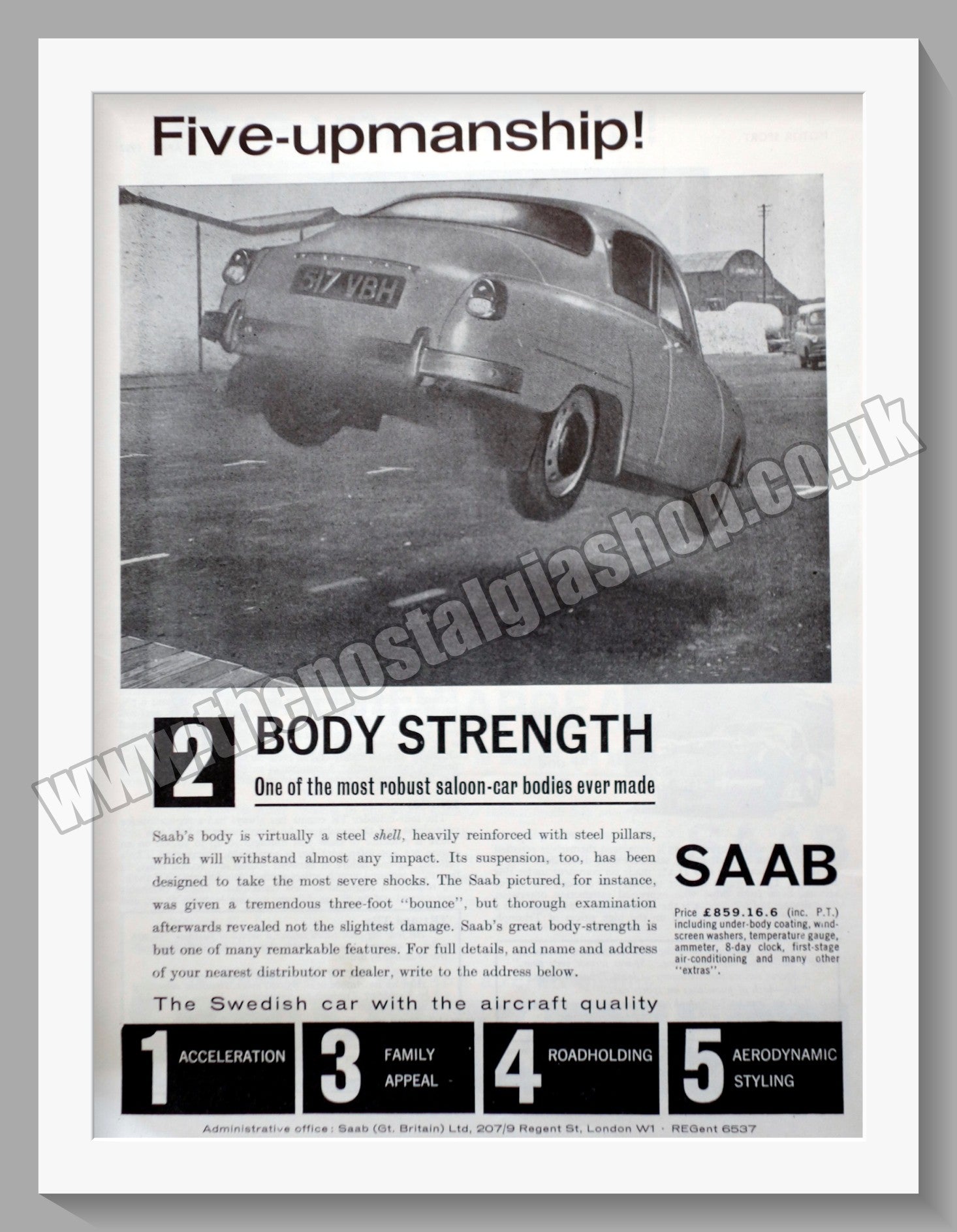 Saab. Five-Upmanship! Rare opportunity to acquire the full set of 5 Original adverts 1962. (Price is for all 5 adverts) Each is presented and Supplied in a 14 x 11 Inch, cream bevel cut mount with backing card and clear bag. Ready to frame. All our adverts, unless clearly stated are Originals from the date shown They make excellent pieces of wall art and stunning gifts. Many are rare and hard to find and once sold, may not be replaced. Remember you are buying a piece of history. Website watermark is not on original.