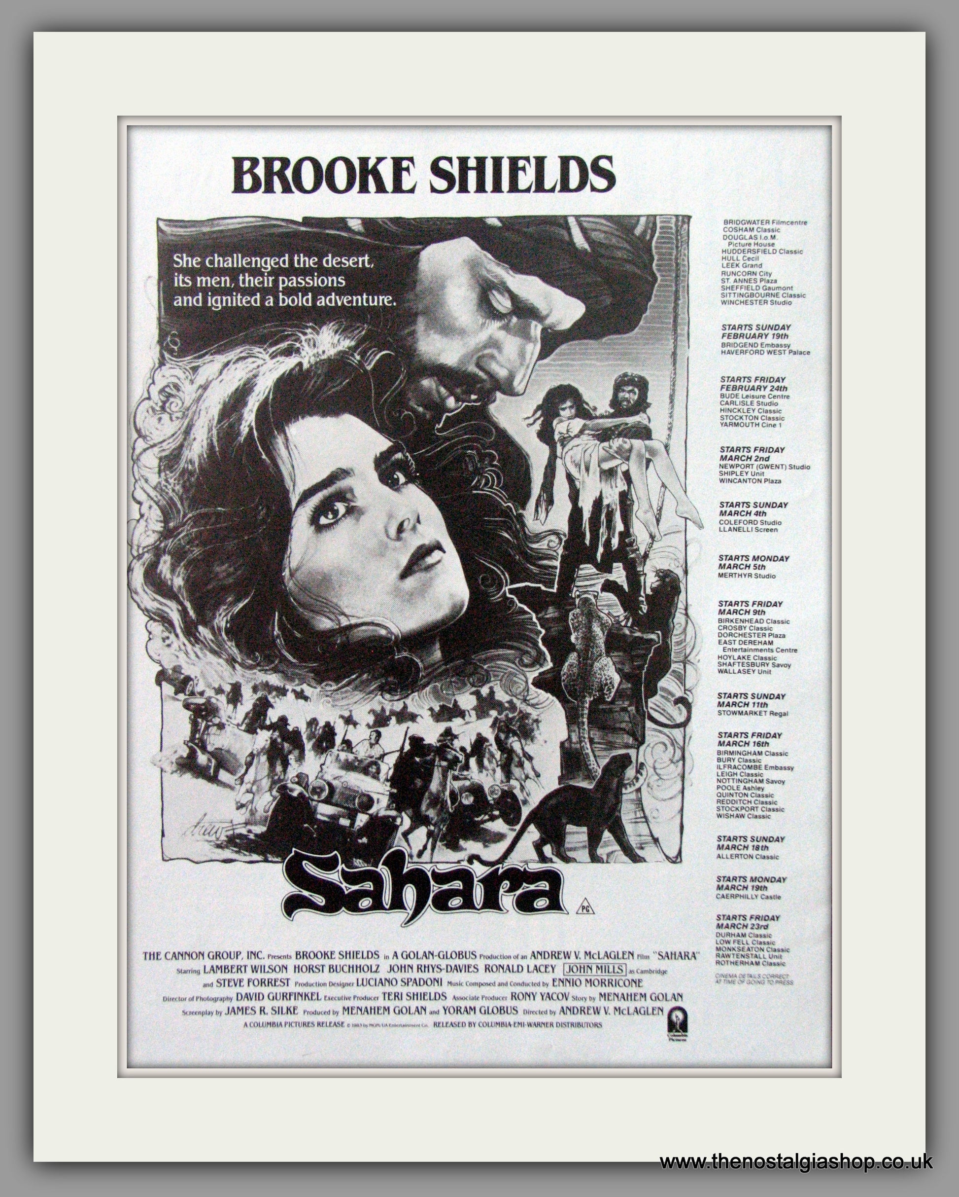 Sahara-Brooke Shields, Lambert Wilson, John Mills. Classic Original advert 1984. Presented in cream bevel cut mount with backing card and clear bag. Ready to fit in 14 x 11 inch frame. Want it framing? If so, buy this then go to Frames Available Category. Click to buy on the suitable frame and we will do the rest. All our adverts, unless clearly stated are Originals from the date shown. They make excellent pieces of wall art and stunning gifts. Many are rare and hard to find and once sold, may not be replaced. Remember you are buying a piece of history. Website watermark is not on original.