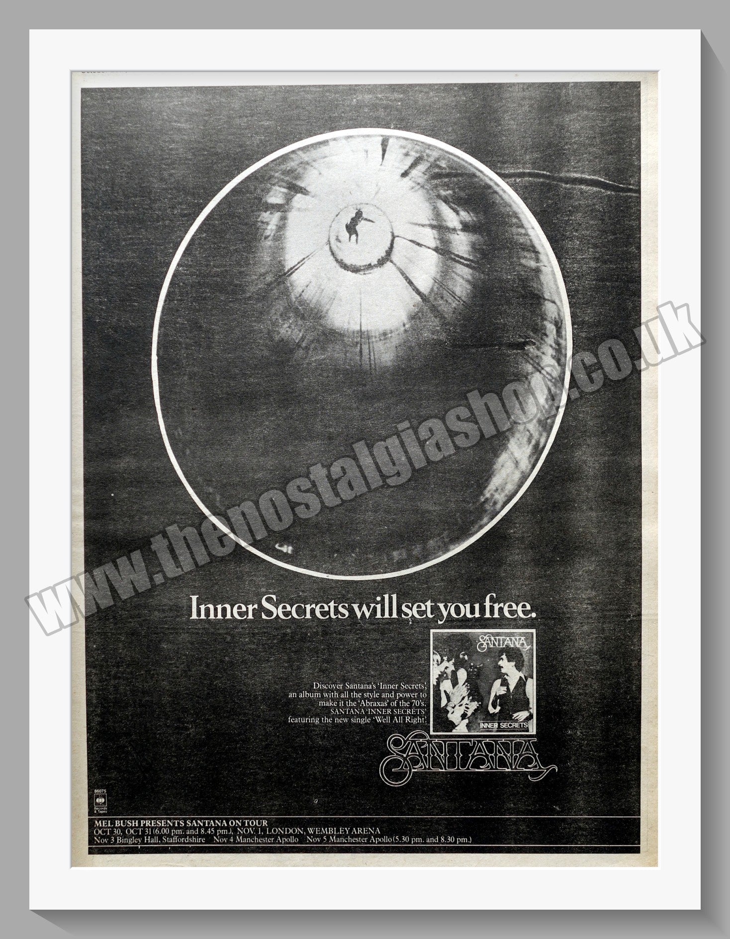 Santana Inner Secrets. This is a large Original Vintage Advert 1978. Presented and Supplied in a cream, bevel cut mount with backing card and clear bag. Any questions or inquiries, please get in touch, we are here to help! All our adverts, unless clearly stated are Originals from the date shown. They make excellent pieces of wall art and stunning gifts. Many are rare and hard to find and once sold, may not be replaced. Remember you are buying a piece of history. Website watermark is not on original.