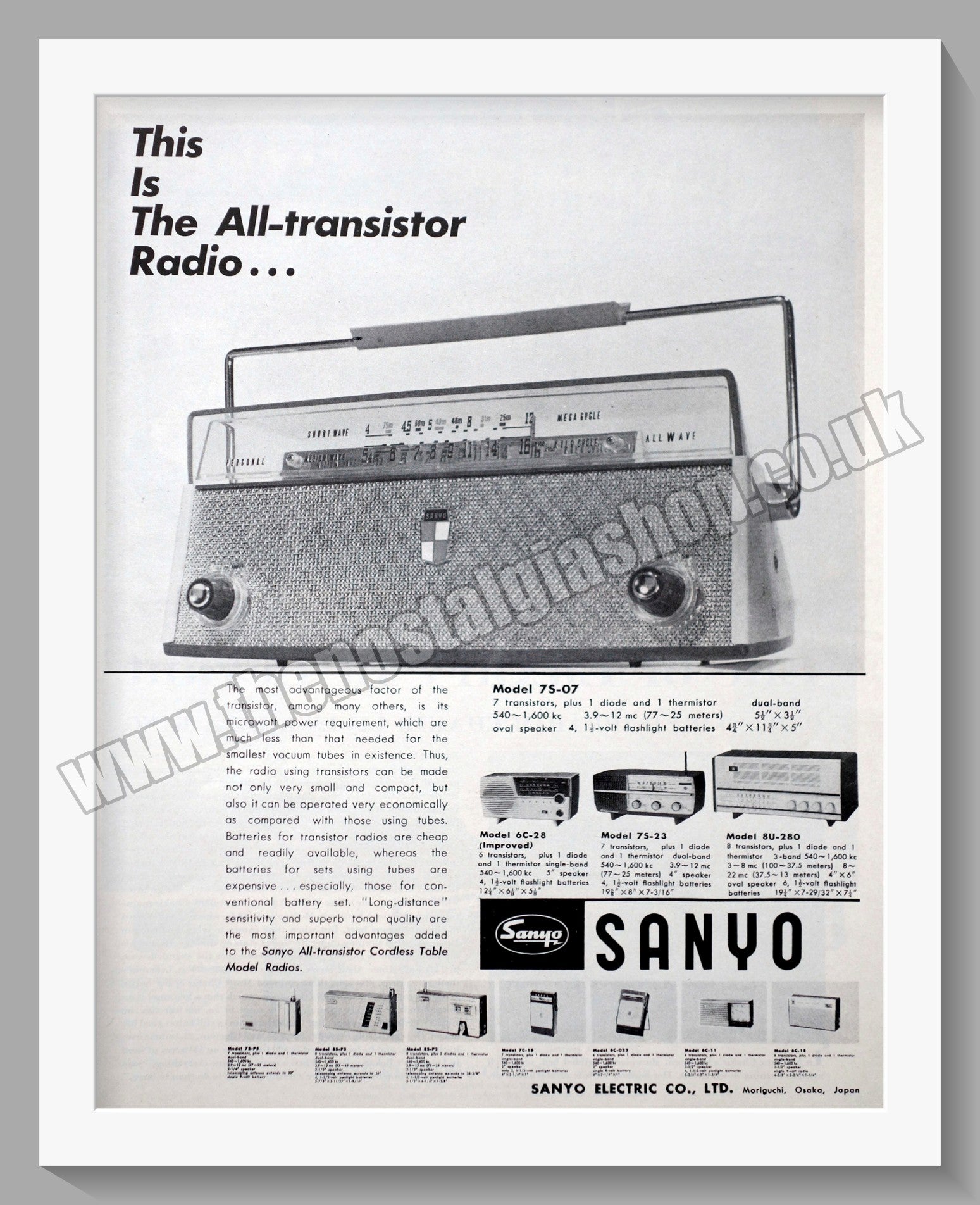Sanyo All-Transistor Radio 7s-07. Vintage Advert. This is a large classic Original advert 1960. Presented and Supplied in a cream bevel cut mount with backing card and clear bag. Ready to fit in 18 x 14 inch frame. The mounted advert will be posted via courier and well packed - protected with a sheet of hardboard to keep it rigid. Any questions or inquiries, please get in touch, we are here to help! All our adverts, unless clearly stated are Originals from the date shown. They make excellent pieces of wall art and stunning gifts. Many are rare and hard to find and once sold, may not be replaced. Remember you are buying a piece of history. Website watermark is not on original .