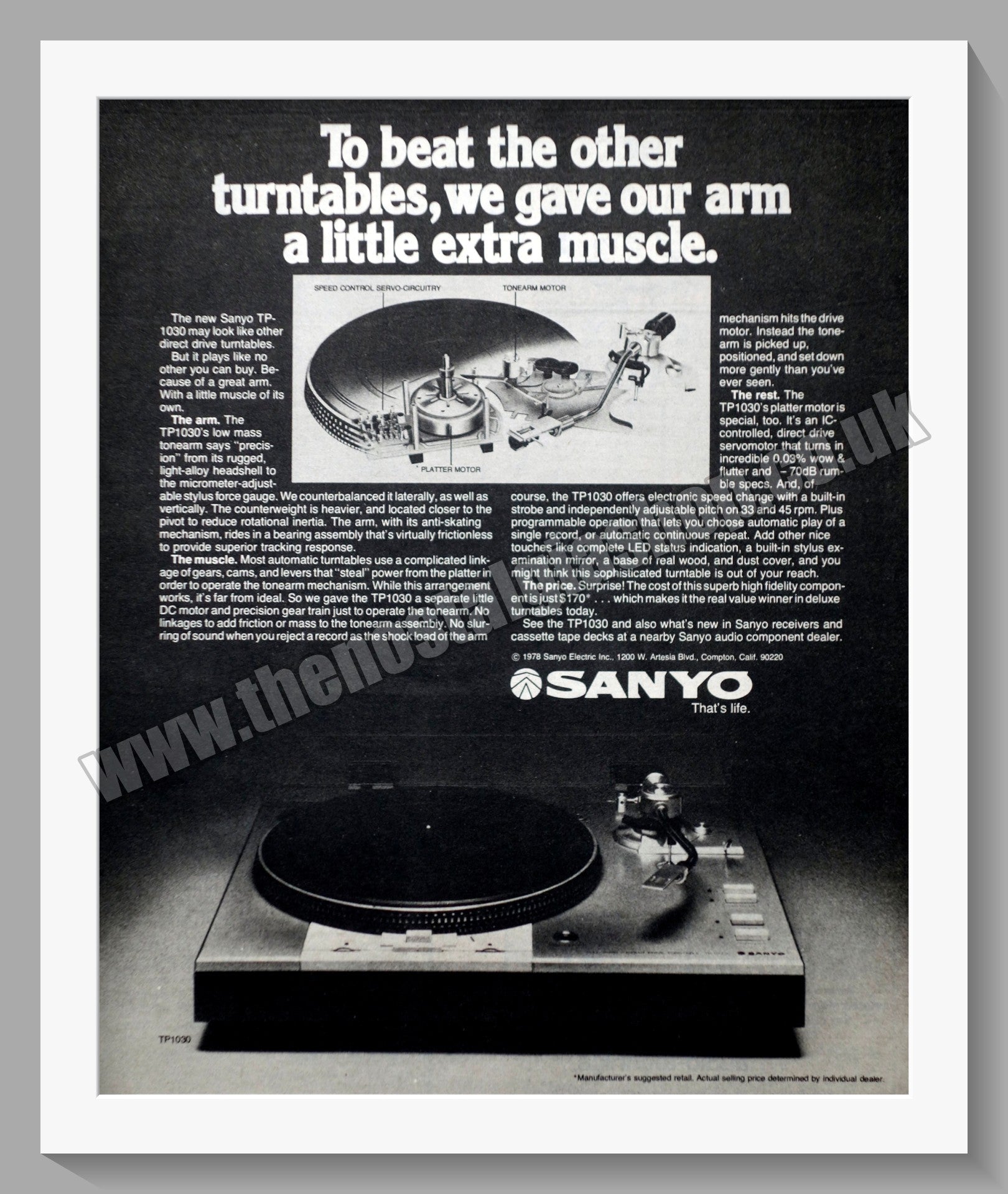 Sanyo TP-1030 Turntable. Vintage Advert. This is a large classic Original advert 1978. Presented and Supplied in a cream bevel cut mount with backing card and clear bag. Ready to fit in 18 x 14 inch frame. The mounted advert will be posted via courier and well packed - protected with a sheet of hardboard to keep it rigid. Any questions or inquiries, please get in touch, we are here to help! All our adverts, unless clearly stated are Originals from the date shown. They make excellent pieces of wall art and stunning gifts. Many are rare and hard to find and once sold, may not be replaced. Remember you are buying a piece of history. Website watermark is not on original .