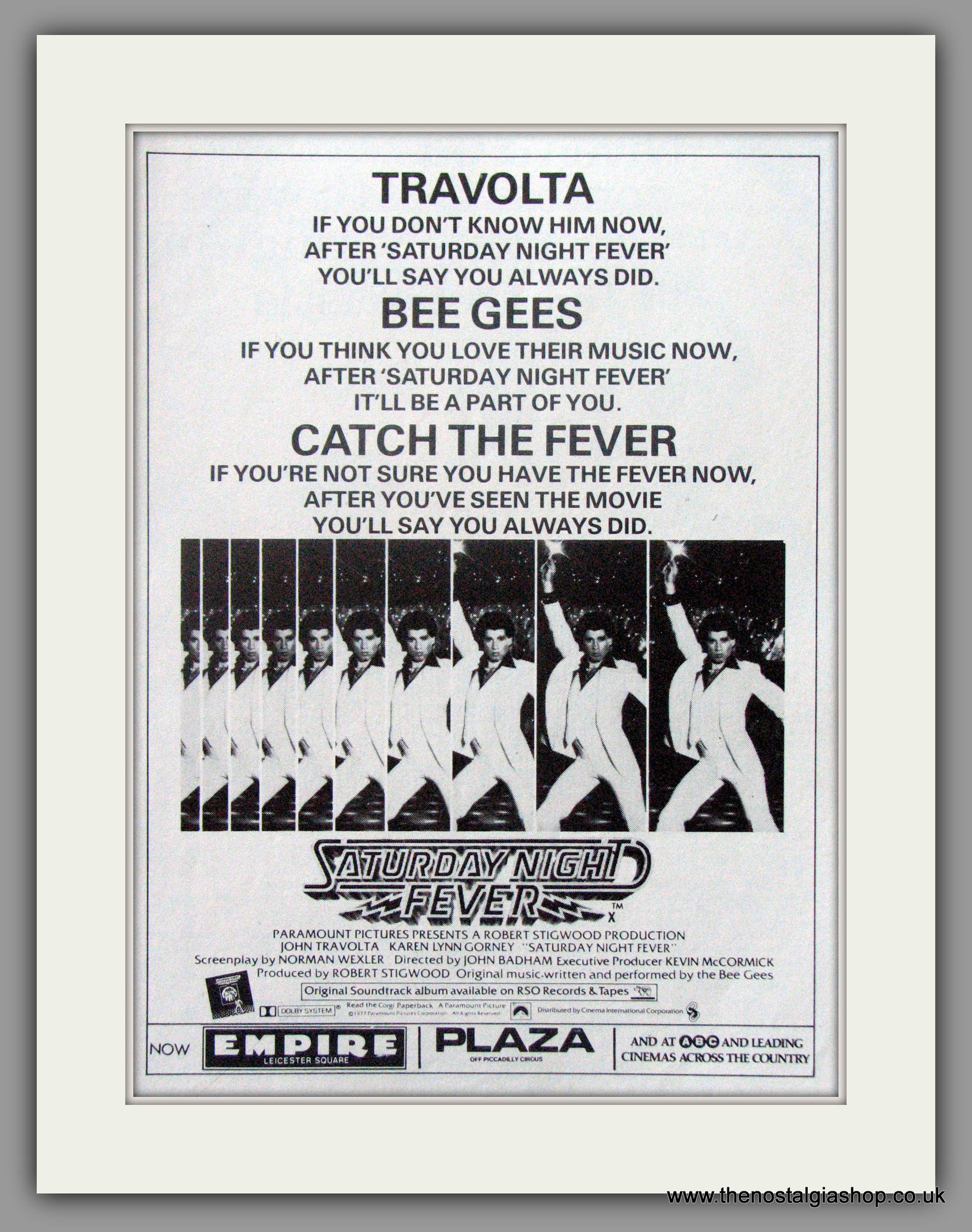 Saturday Night Fever-Travolta, Bee Gees. Classic Original advert 1978. Presented in cream bevel cut mount with backing card and clear bag Ready to fit in 14 x 11 inch frame. Want it framing? if so, buy this then go to Frames Available Category. Click to buy on the suitable frame and we will do the rest. All our adverts, unless clearly stated are Originals from the date shown They make excellent pieces of wall art and stunning gifts. Many are rare and hard to find and once sold, may not be replaced. Remember you are buying a piece of history. Website watermark is not on original.