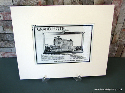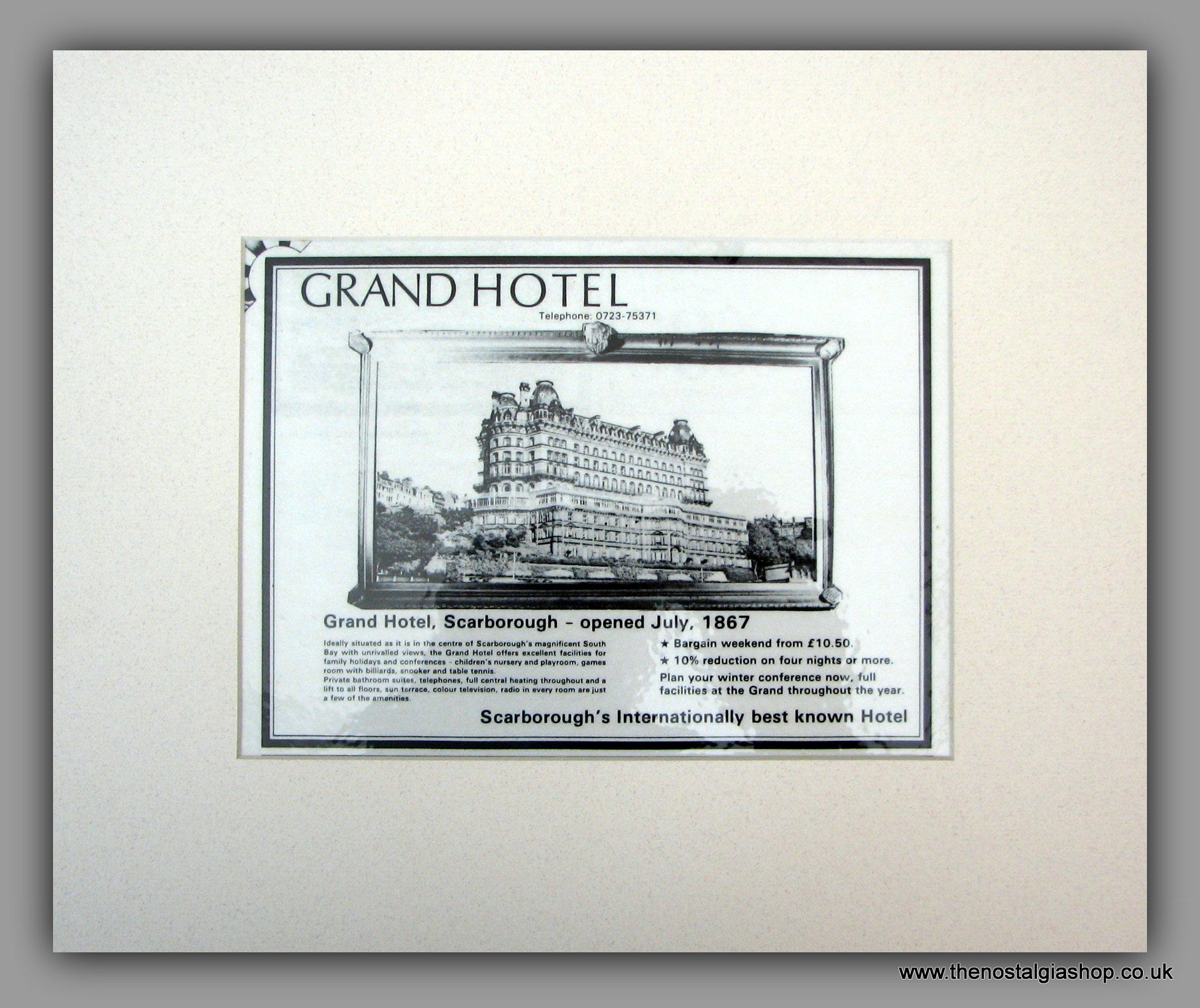 The Grand Hotel Scarborough. Classic Original advert 1978. Presented in cream bevel cut mount with backing card and clear bag. Ready to fit in 12 x 10 inch frame. Want it framing? If so, buy this then go to Frames Available Category. Click to buy on the suitable frame and we will do the rest. All our adverts, unless clearly stated are Originals from the date shown They make excellent pieces of wall art and stunning gifts. Many are rare and hard to find and once sold, may not be replaced. Remember you are buying a piece of history. Website watermark is not on original.