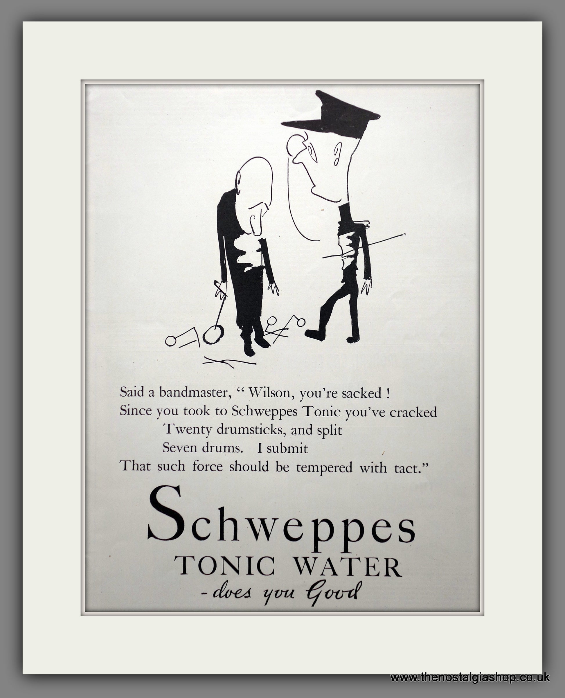 Schweppes Tonic Water. This is a large classic Original advert 1935. Presented in cream bevel cut mount with backing card and clear bag. Ready to fit in 18 x 14 inch frame. The mounted advert will be posted via courier and well packed - protected with a sheet of hardboard to keep it rigid. Any questions or enquiries, please get in touch, we are here to help! All our adverts, unless clearly stated are Originals from the date shown. They make excellent pieces of wall art and stunning gifts. Many are rare and hard to find and once sold, may not be replaced. Remember you are buying a piece of history. Website watermark is not on original.