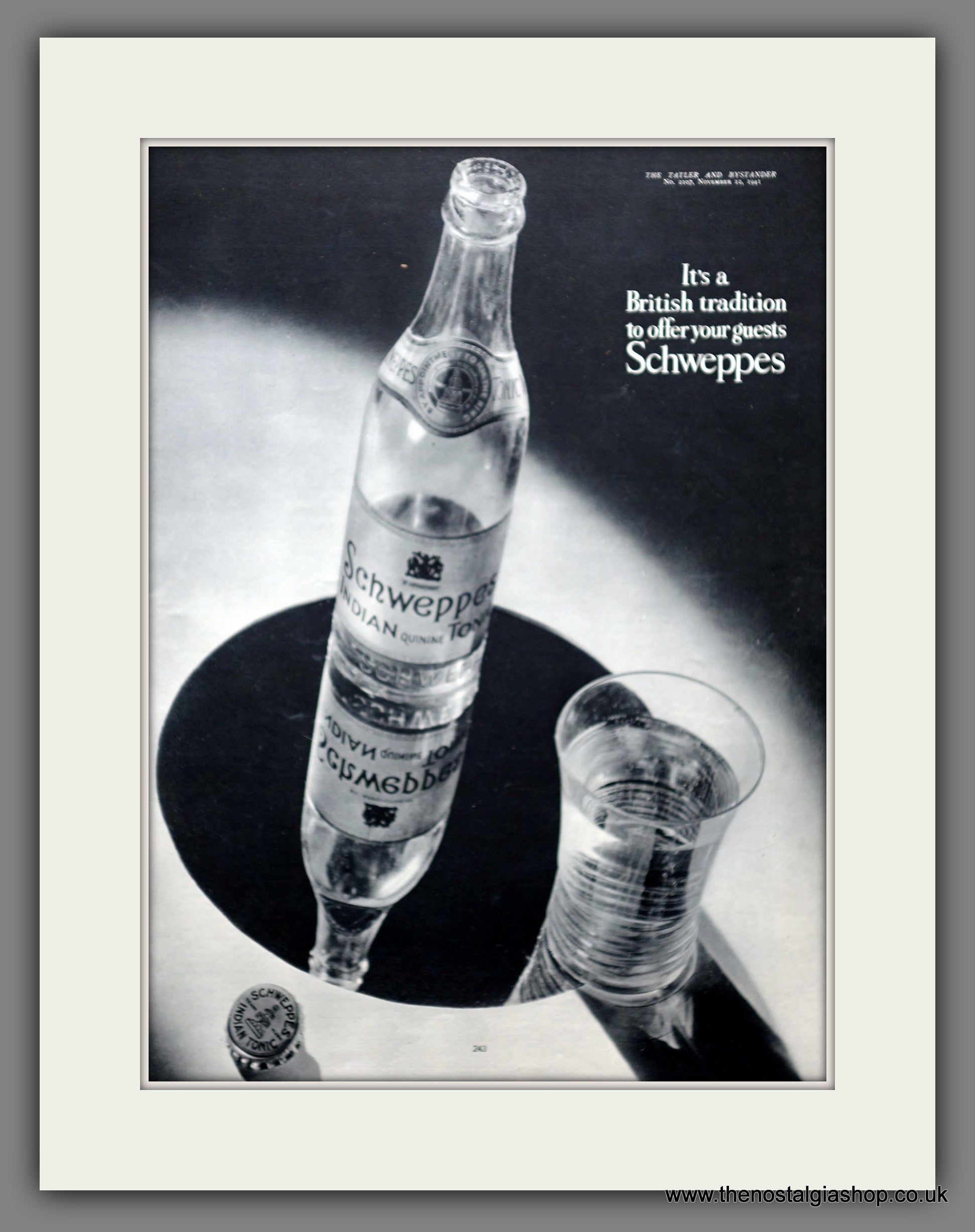 Schweppes Tonic Water. This is a large classic Original advert 1941. Presented in cream bevel cut mount with backing card and clear bag. Ready to fit in 18 x 14 inch frame. The mounted advert will be posted via courier and well packed - protected with a sheet of hardboard to keep it rigid. Any questions or enquiries, please get in touch, we are here to help! All our adverts, unless clearly stated are Originals from the date shown. They make excellent pieces of wall art and stunning gifts. Many are rare and hard to find and once sold, may not be replaced. Remember you are buying a piece of history. Website watermark is not on original.