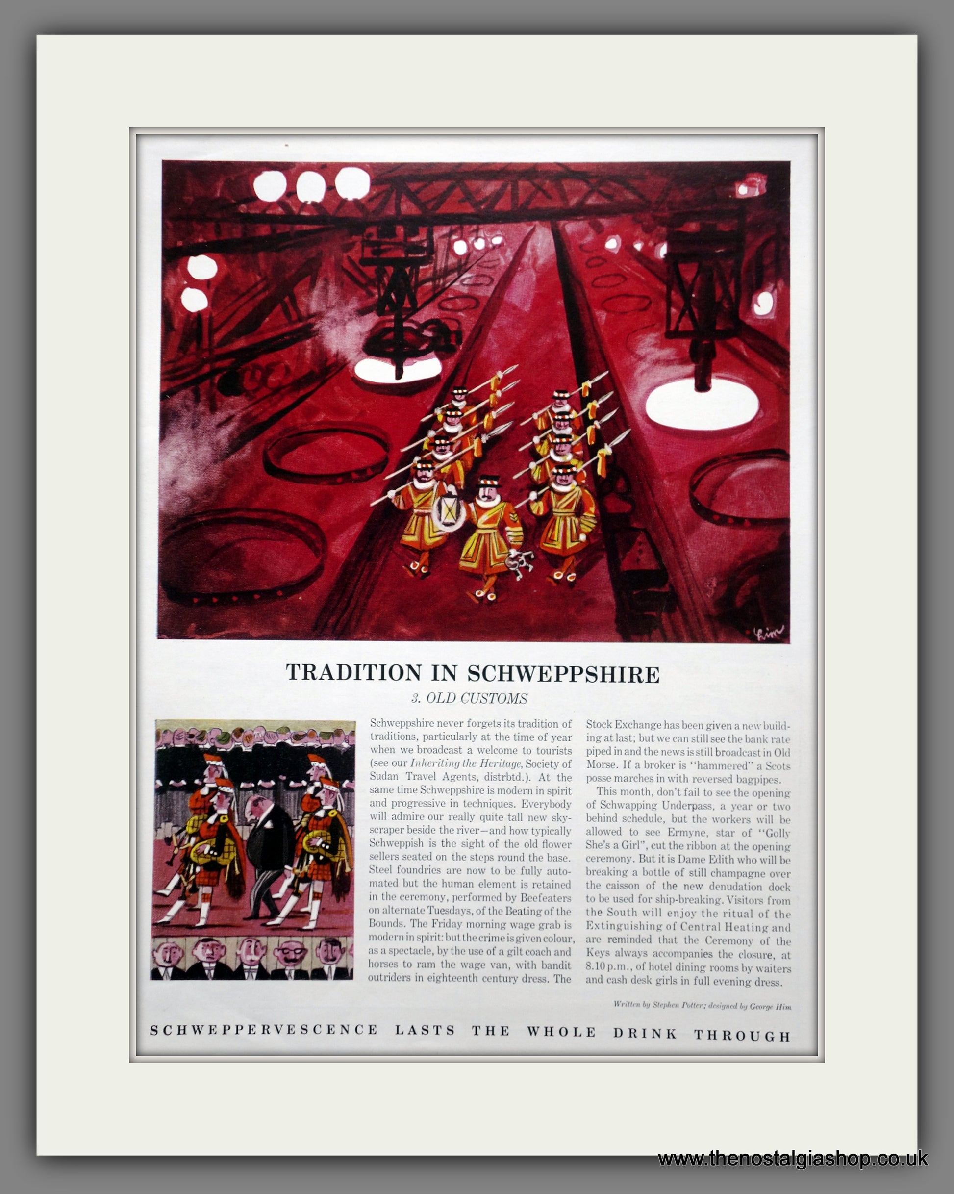 Schweppes Tonic Water. This is a large classic Original advert 1958. Presented in cream bevel cut mount with backing card and clear bag. Ready to fit in 18 x 14 inch frame. The mounted advert will be posted via courier and well packed - protected with a sheet of hardboard to keep it rigid. Any questions or enquiries, please get in touch, we are here to help! All our adverts, unless clearly stated are Originals from the date shown. They make excellent pieces of wall art and stunning gifts. Many are rare and hard to find and once sold, may not be replaced. Remember you are buying a piece of history. Website watermark is not on original.
