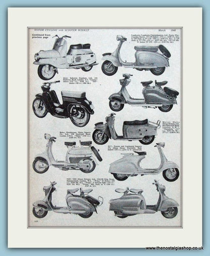 Scooter Range 1960! Here you will get 2 pages of Scooter images, each is double sided, so 4 sides of images.Supplied with 2 crème mounts, each is 14 by 11 inches, so you can chose the sides to display. Classic original Scooter ad pages 1960. Each is ready to fit in 14 x 11 inch frame. Want them framing? If so, buy these then go to Frames Available Category. Click to buy on the suitable frame(s) and we will do the rest. All our adverts, unless clearly stated are Originals from the date shown They make excellent pieces of wall art and stunning gifts. Many are rare and hard to find and once sold, may not be replaced. Remember you are buying a piece of history. Website watermark is not on original.