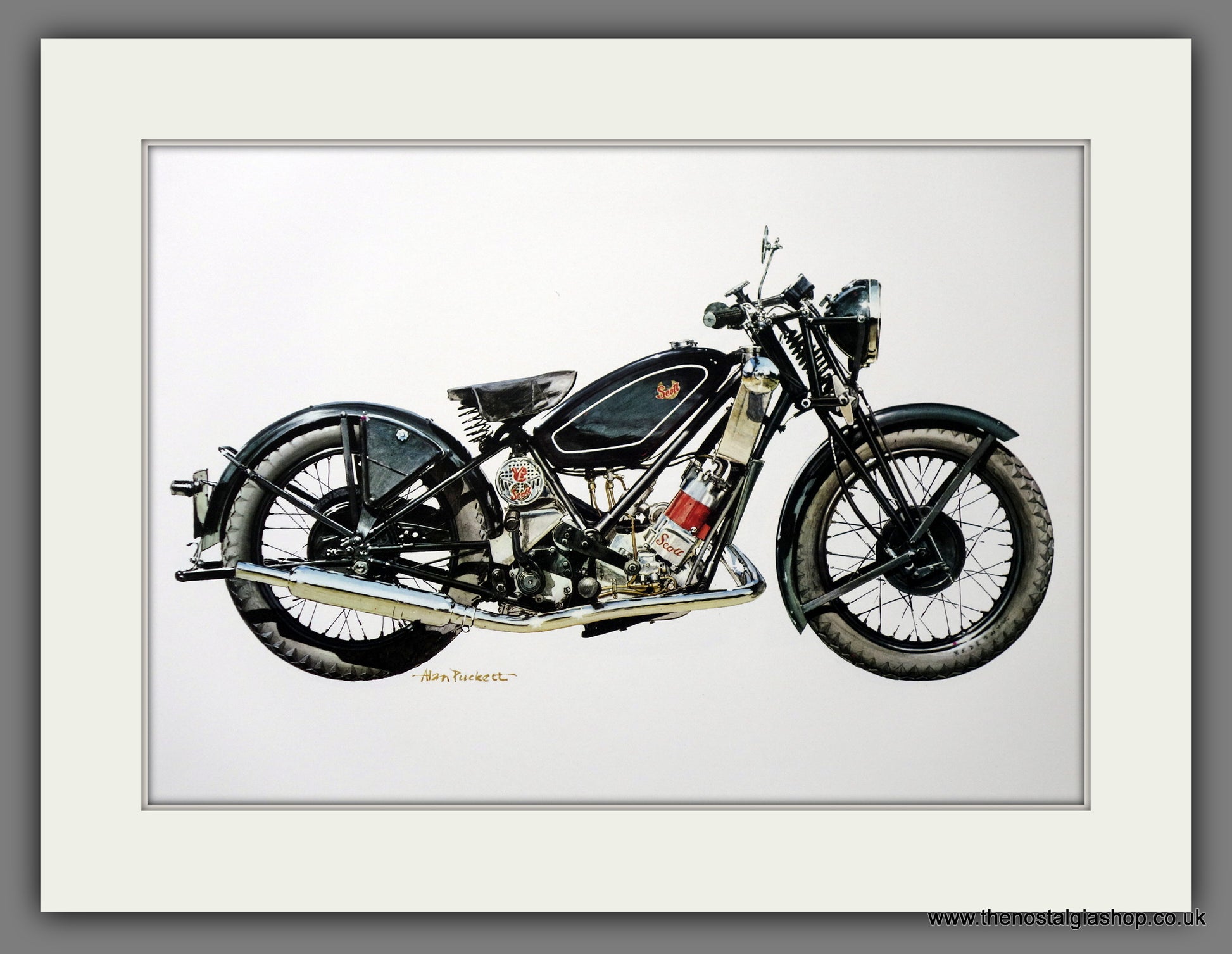 Scott Flying Squirrel. 1938 Motor Cycle. Classic Print from 1970's. Presented and Supplied in a cream bevel cut mount with backing board and Clear Bag. Made to fit straight into 14 x 11 inch frame. Motorcycle Prints.