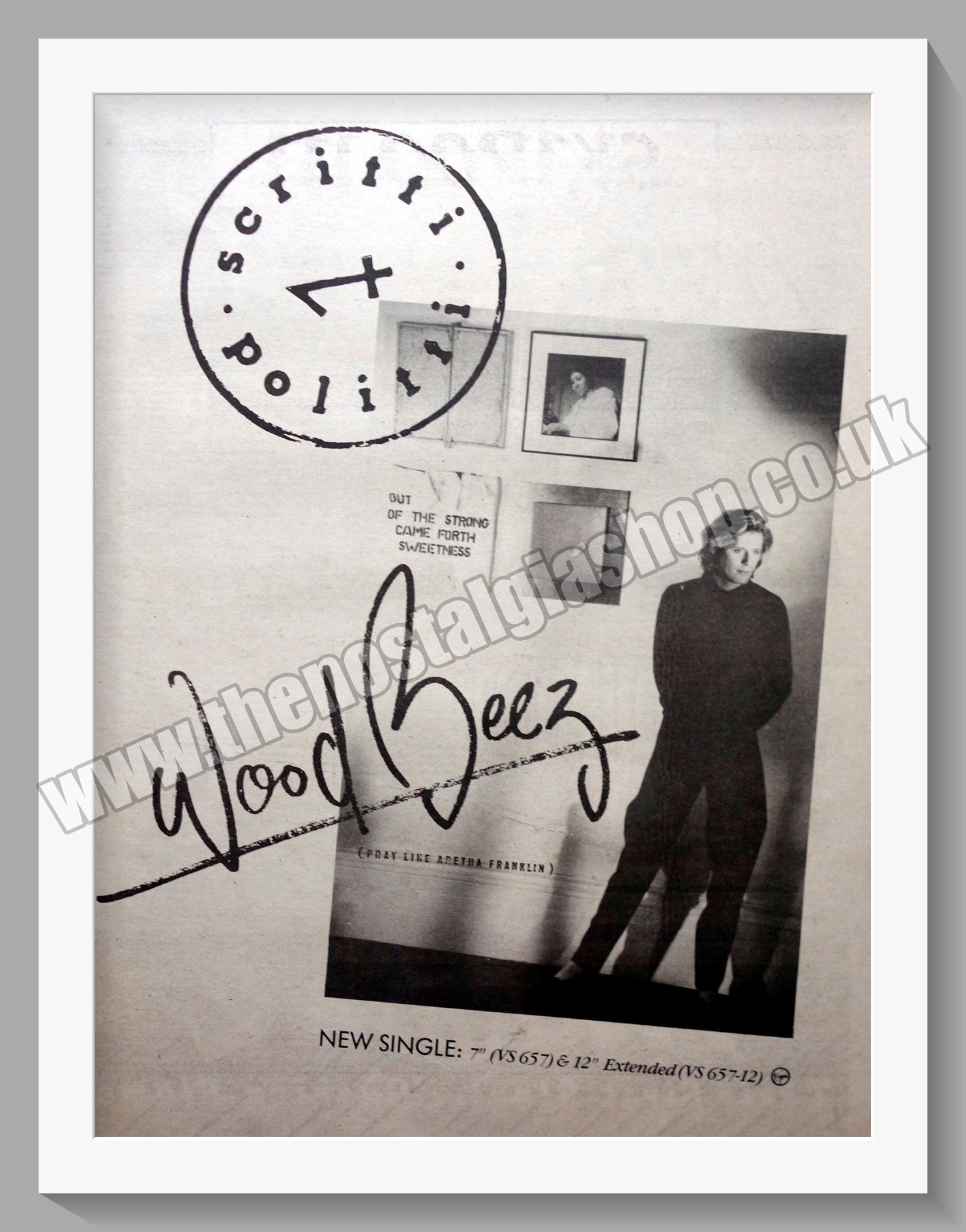 Scritti Politti Wood Beez. Large original advert 1984. Presented and Supplied in cream bevel cut mount with backing card and clear bag. Ready to fit in 20 x 16 inch frame. All our adverts, unless clearly stated are Originals from the date shown. They make excellent pieces of wall art and stunning gifts. Many are rare and hard to find and once sold, may not be replaced. Remember you are buying a piece of history. Website watermark is not on original.