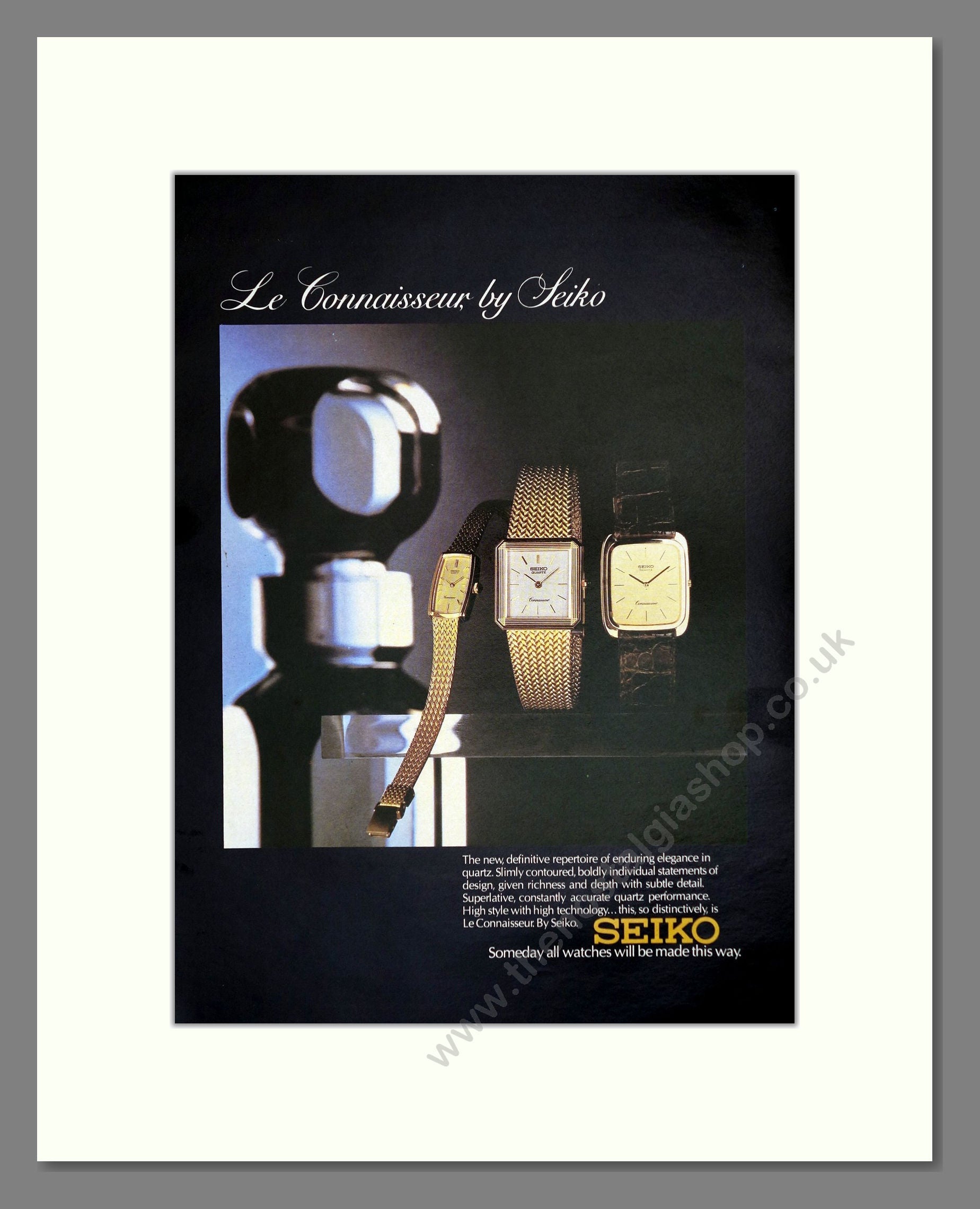 Seiko - Le Connaisseur. Vintage Advert. This is a classic original advert from 1980. Presented and supplied in a cream bevel cut mount with backing card and clear bag. Ready to fit in a 14 x 11 inches frame. The mounted advert will be posted via courier and well packed - protected with a sheet of hardboard to keep it rigid. Any questions or enquiries, please get in touch, we are here to help! All our adverts, unless clearly stated are originals from the date shown. They make excellent pieces of wall art and stunning gifts. Many are rare and hard to find and once sold, may not be replaced. Remember you are buying a piece of history. Website watermark is not on original.