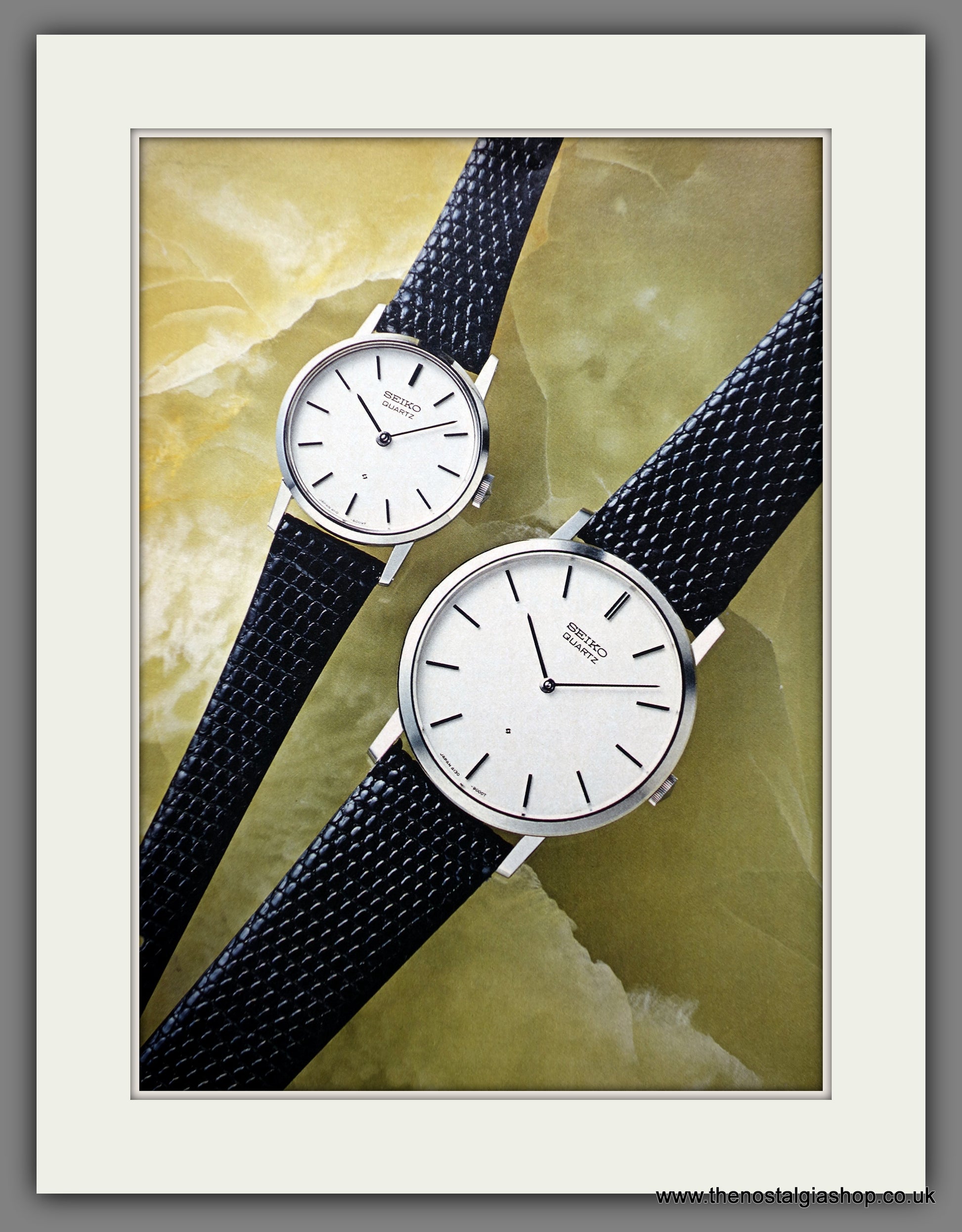 Seiko Quartz Watches. Vintage Double Advert. Original Advert 1976. Presented and Supplied in 2 cream bevel cut mounts with backing card and clear bag. Ready to fit in two 14 x 11 inch frames. All our adverts, unless clearly stated are Originals from the date shown. They make excellent pieces of wall art and stunning gifts. Many are rare and hard to find and once sold, may not be replaced. Remember you are buying a piece of history. Website watermark is not on original.