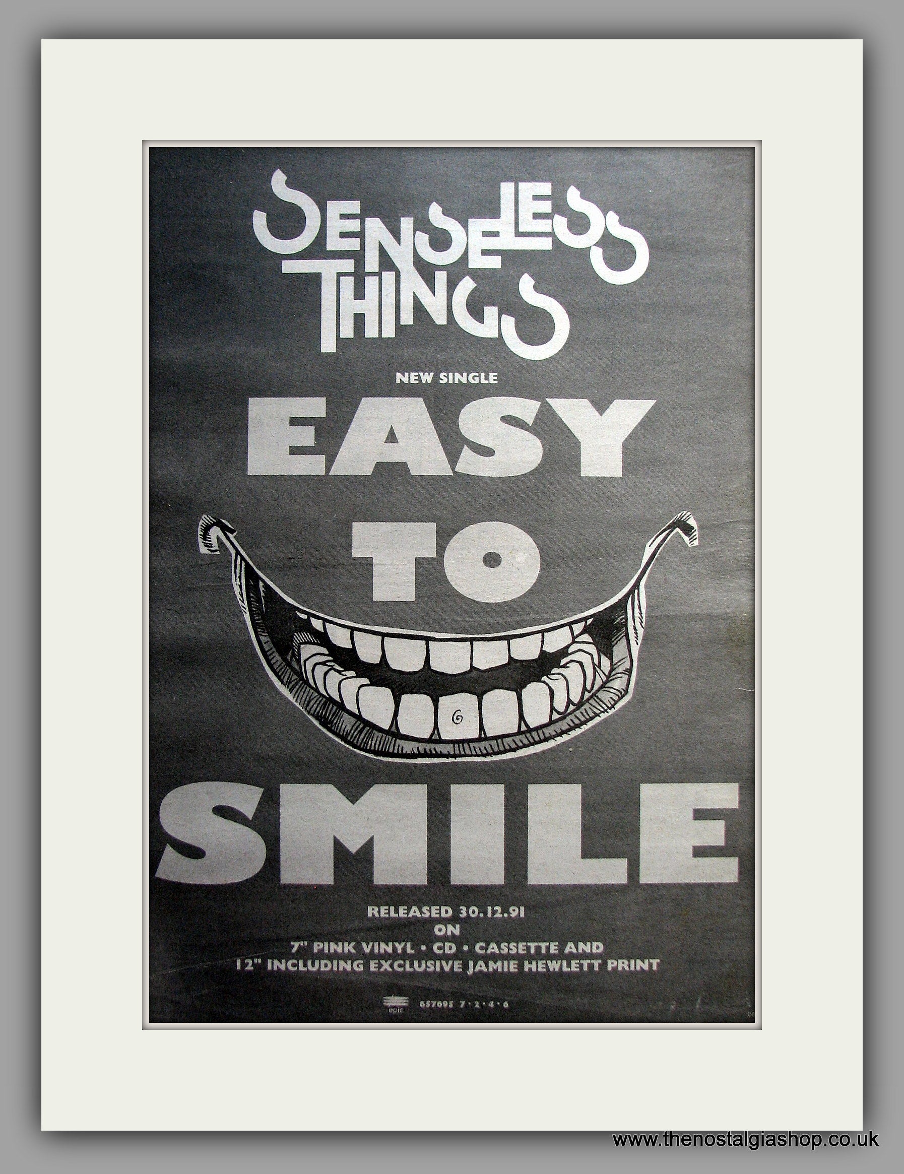 Senseless Things - Easy To Smile. Original Vintage Advert 1991 (ref AD11108). Presented and supplied in a cream bevel cut mount with backing card and clear bag. Ready to fit in a 20x16 inch frame. The mounted advert will be posted via courier and well packed - protected with a sheet of hardboard to keep it rigid. Any questions or enquiries, please get in touch, we are here to help! All our adverts, unless clearly stated are originals from the date shown. They make excellent pieces of wall art and stunning gifts. Many are rare and hard to find and once sold, may not be replaced. Remember you are buying a piece of history. Website watermark is not on original.