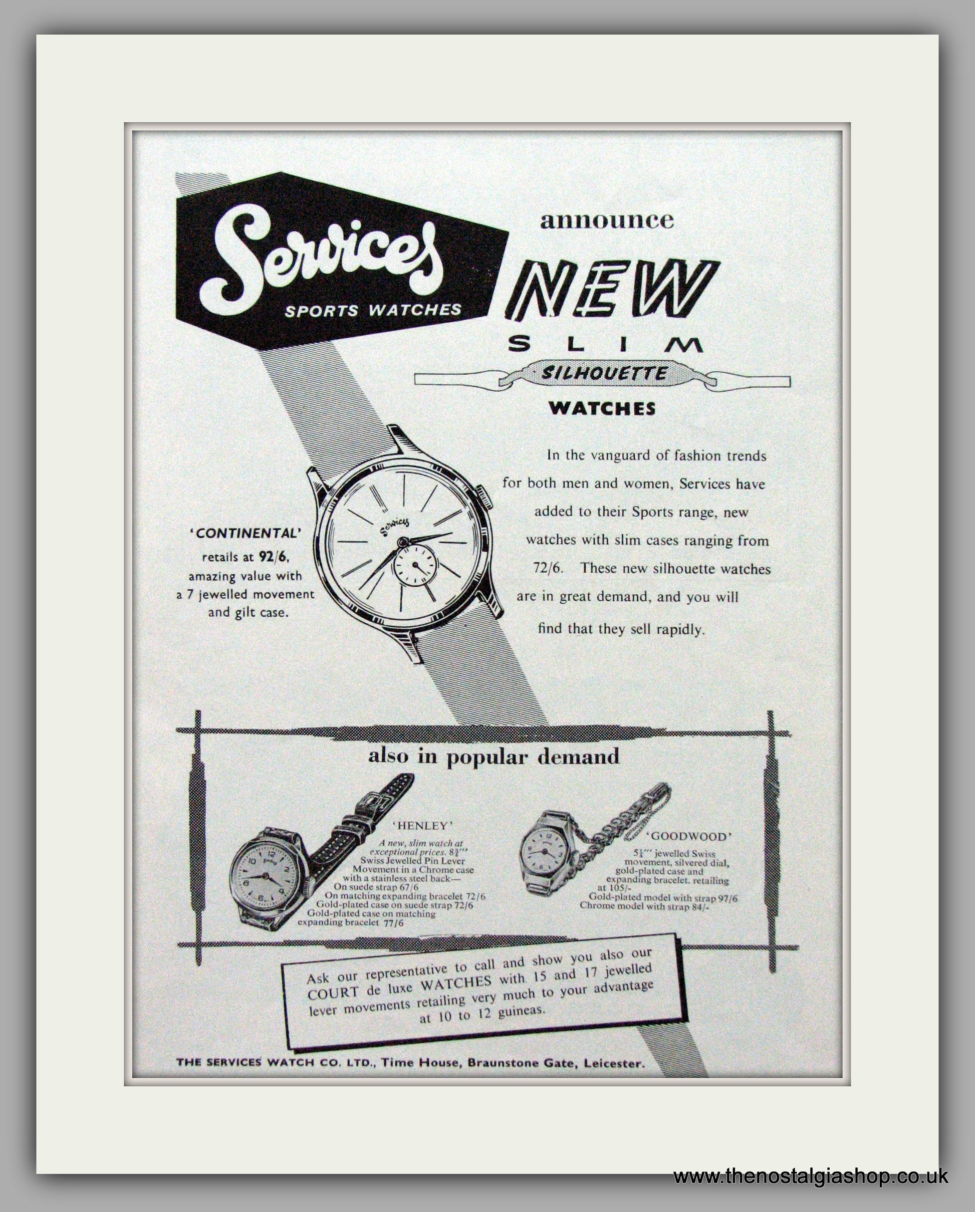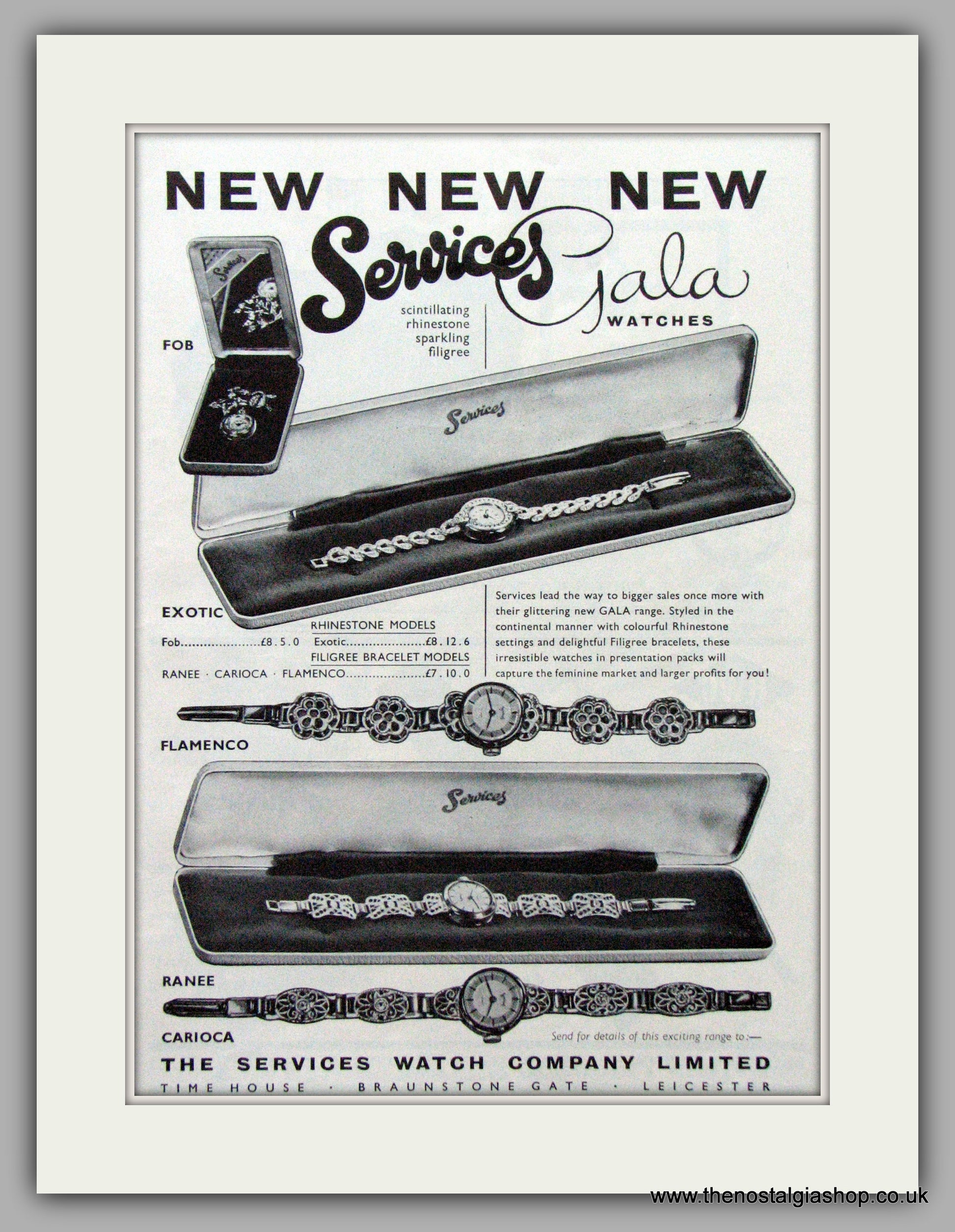 Services Watches. Gala Watches,Slim Silhouette,Special occasions. Vintage Adverts. Original Adverts 1958/60. Presented in cream bevel cut mount with backing card and clear bag. Each is ready to fit in 14 x 11 inch frames. Want them framing? If so, buy this then go to Frames Available Category. Click to buy on the suitable frame(s) and we will do the rest. All our adverts, unless clearly stated are Originals from the date shown. They make excellent pieces of wall art and stunning gifts. Many are rare and hard to find and once sold, may not be replaced. Remember you are buying a piece of history. Website watermark is not on original.
