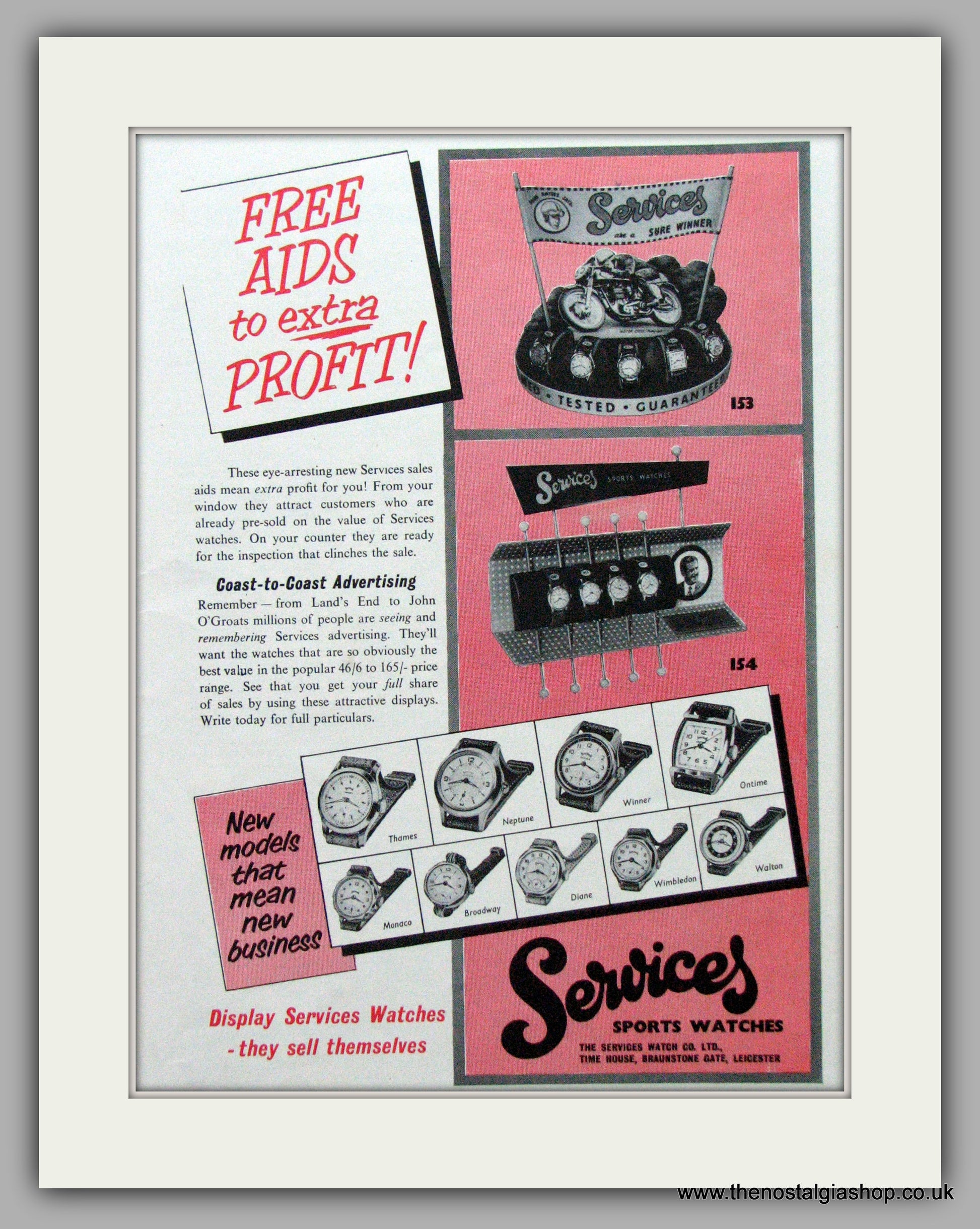 Services Watches. Free aids to extra profit. Vintage Advert. Original Advert 1956. Presented in cream bevel cut mount with backing card and clear bag. Ready to fit in 14 x 11 inch frame. Want it framing? If so, buy this then go to Frames Available Category. Click to buy on the suitable frame(s) and we will do the rest. All our adverts, unless clearly stated are Originals from the date shown. They make excellent pieces of wall art and stunning gifts. Many are rare and hard to find and once sold, may not be replaced. Remember you are buying a piece of history. Website watermark is not on original.