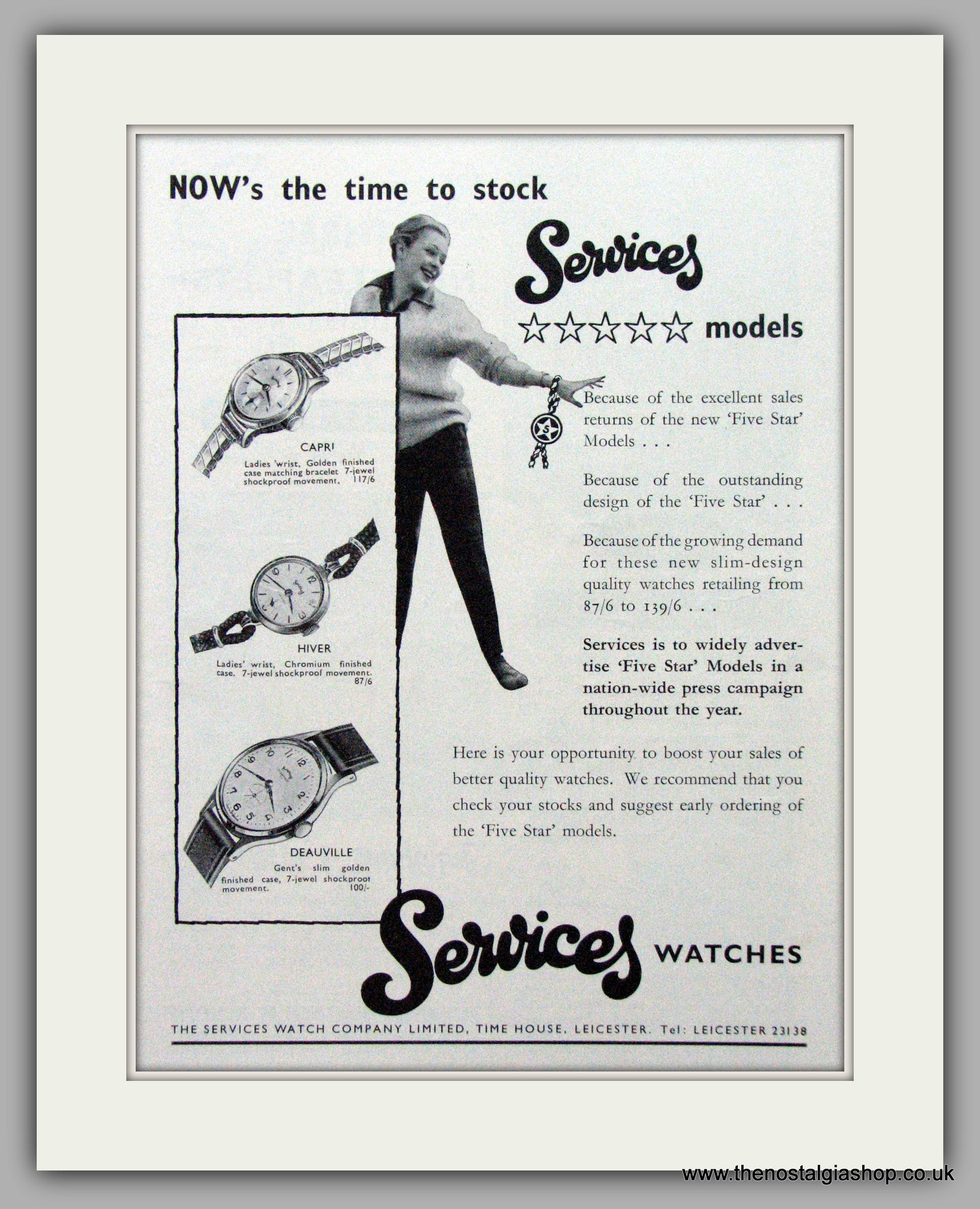 Services Watches. Vintage Adverts. Set of 3 Original Adverts 1957/58/59. Presented in cream bevel cut mounts with backing card and clear bags. Ready to fit in 14 x 11 inch frames. Want them framing? If so, buy this then go to Frames Available Category. Click to buy on the suitable frame(s) and we will do the rest. All our adverts, unless clearly stated are Originals from the date shown. They make excellent pieces of wall art and stunning gifts. Many are rare and hard to find and once sold, may not be replaced. Remember you are buying a piece of history. Website watermark is not on original.