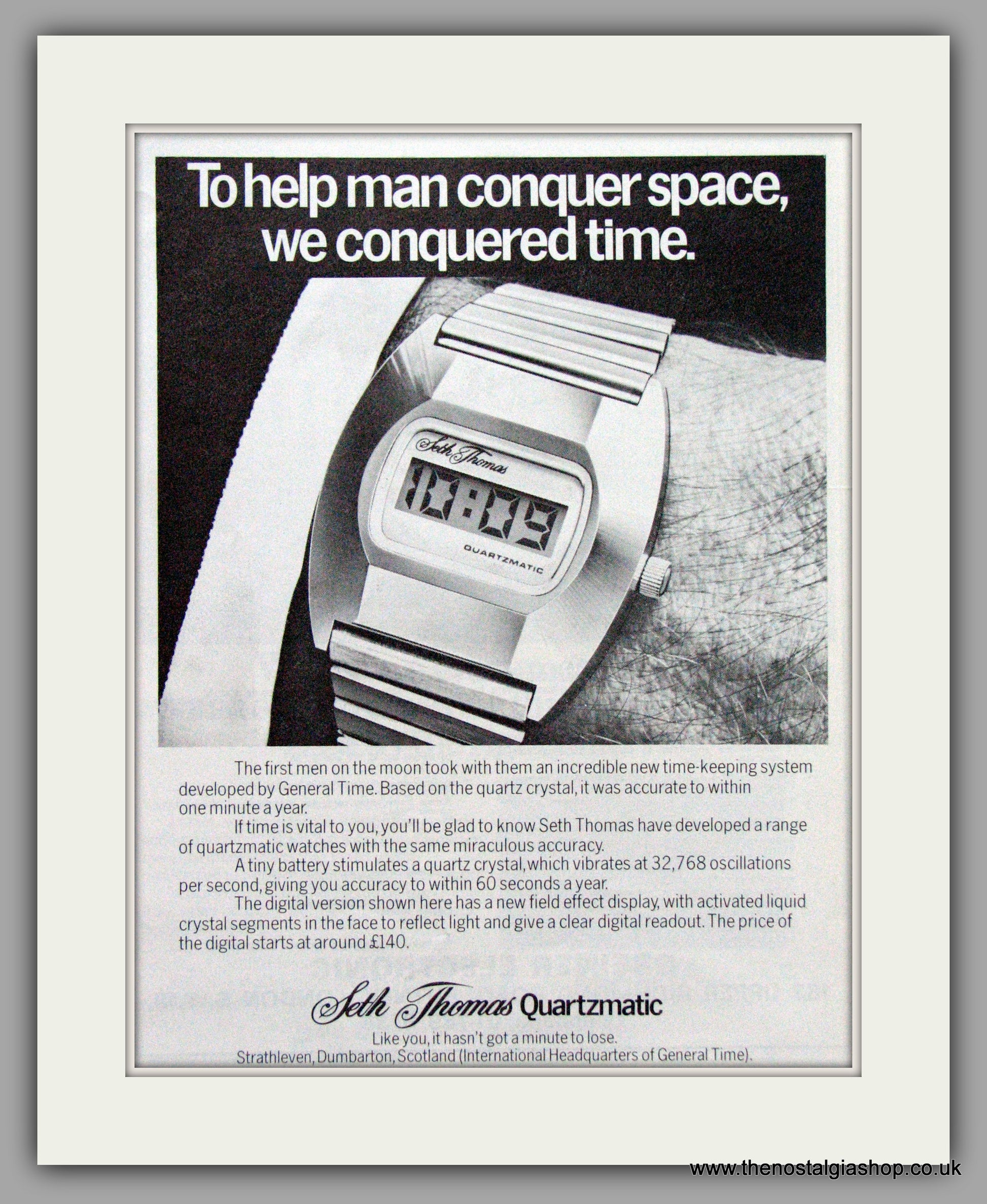 Seth Thomas Quartzmatic Watches. To help man conquer space. Vintage Advert. Original Advert 1975. Presented in cream bevel cut mount with backing card and clear bag. Ready to fit in 14 x 11 inch frame. Want it framing? If so, buy this then go to Frames Available Category. Click to buy on the suitable frame(s) and we will do the rest. All our adverts, unless clearly stated are Originals from the date shown. They make excellent pieces of wall art and stunning gifts. Many are rare and hard to find and once sold, may not be replaced. Remember you are buying a piece of history. Website watermark is not on original.