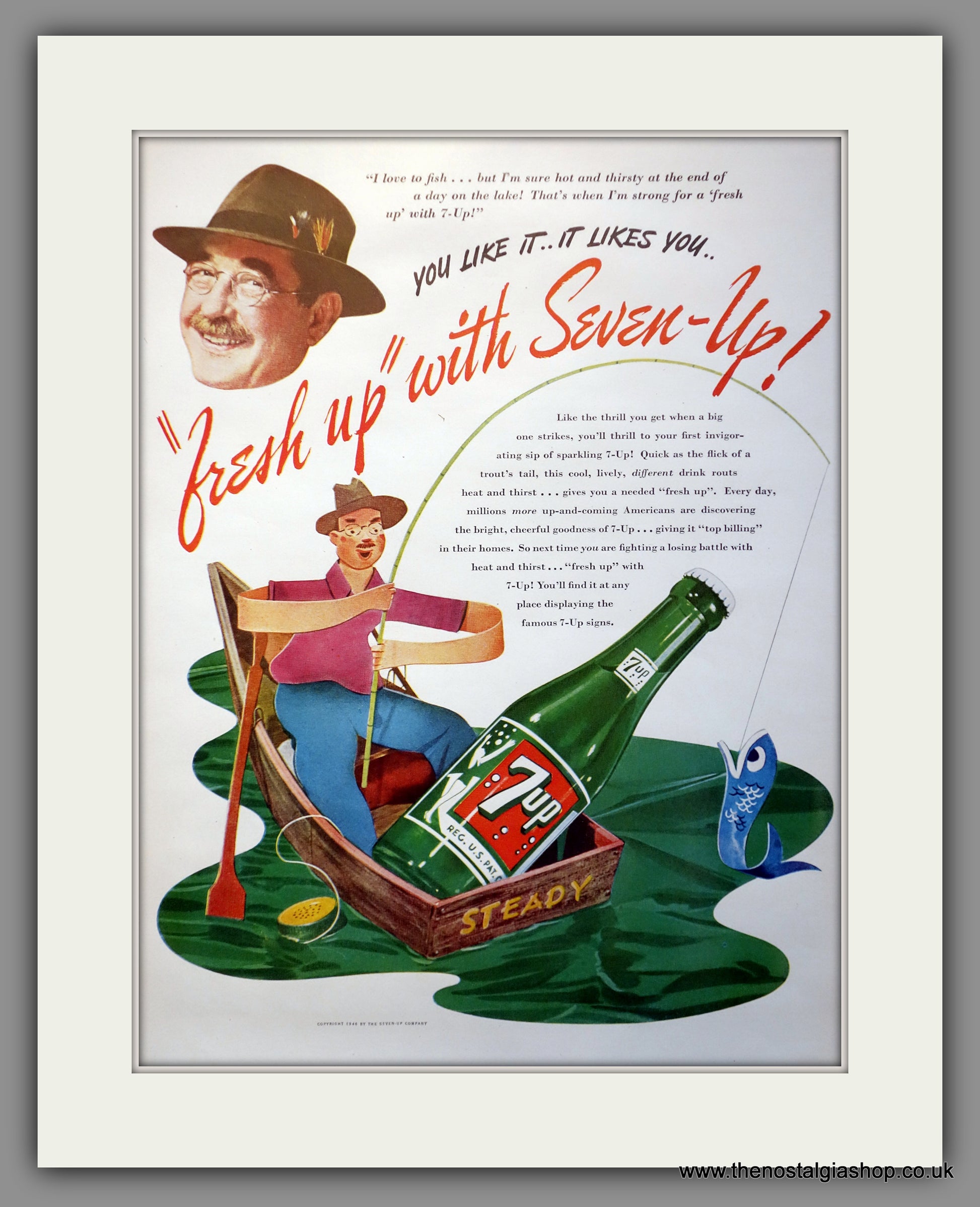 7up. Original Vintage American Advert 1946. Presented and Supplied in a 18 x 14 Inch cream mount with backing board and clear bag. Ready to Frame. All our adverts, unless clearly stated are Originals from the date shown. They make excellent pieces of wall art and stunning gifts. Many are rare and hard to find and once sold, may not be replaced. Remember you are buying a piece of history. Website watermarks are not on original. Adverts will be well packed with hardboard to keep rigid in the post. Soft Drink Adverts. Americana.