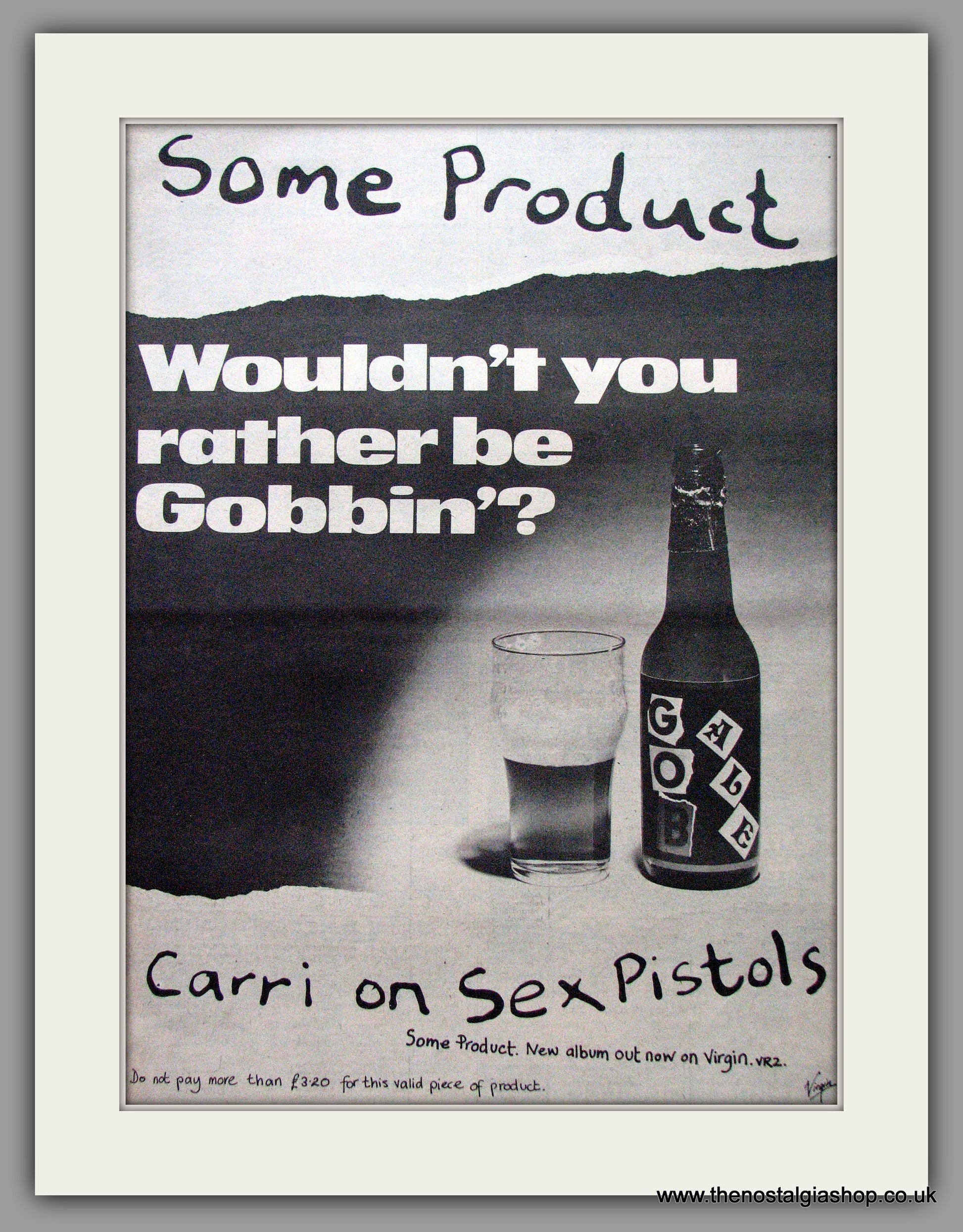 Sex Pistols. Wouldn't You Rather Be Gobbin'. Original Advert 1979 (ref AD9519). Presented and supplied in a cream bevel cut mount with backing card and clear bag. Ready to fit in a 20x16 inch frame. The mounted advert will be posted via courier and well packed - protected with a sheet of hardboard to keep it rigid. Any questions or enquiries, please get in touch, we are here to help! All our adverts, unless clearly stated are originals from the date shown. They make excellent pieces of wall art and stunning gifts. Many are rare and hard to find and once sold, may not be replaced. Remember you are buying a piece of history. Website watermark is not on original.