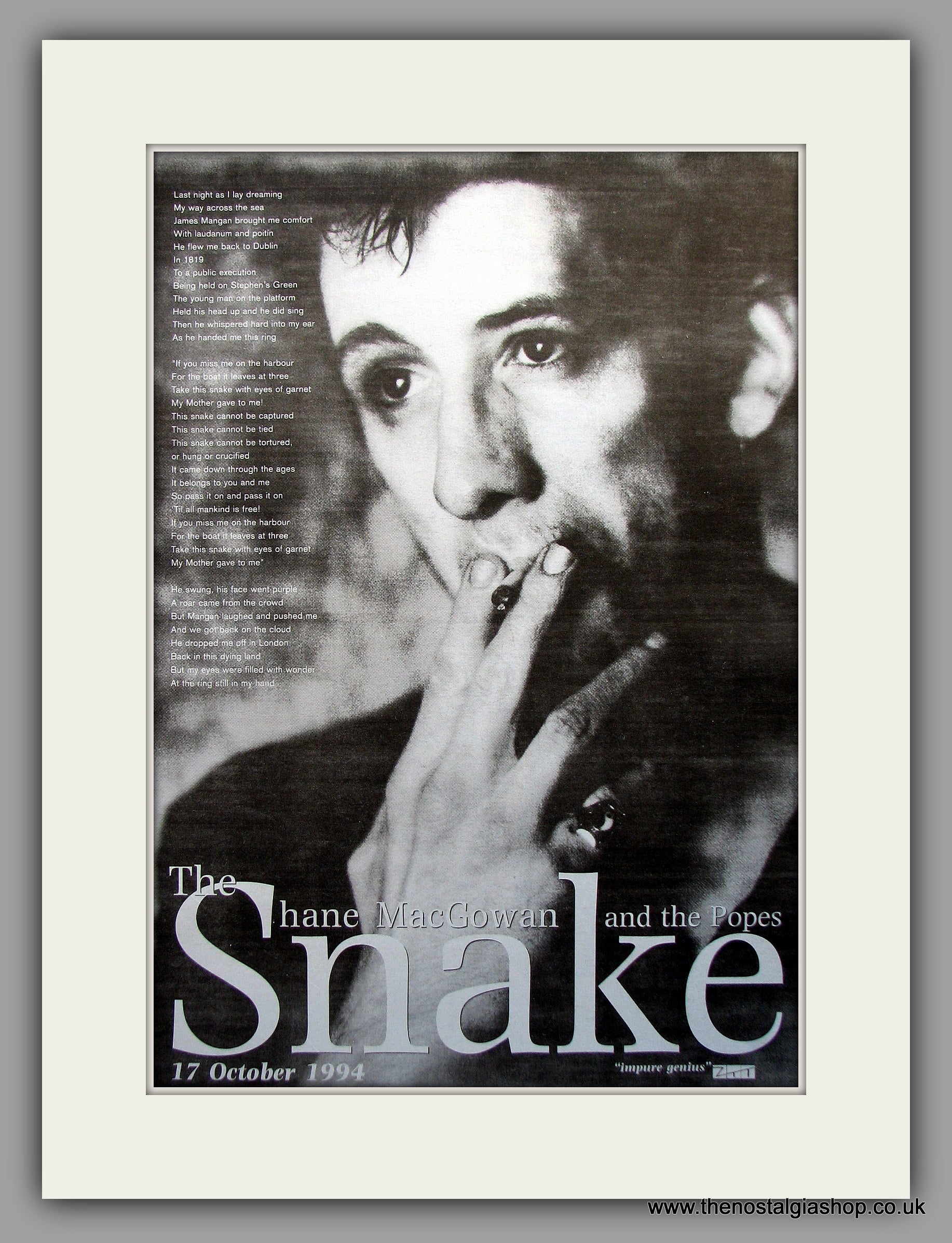 Shane Macgowan. Snake. Original Vintage Advert 1994 (ref AD11048). Presented and supplied in a cream bevel cut mount with backing card and clear bag. Ready to fit in a 20x16 inch frame. The mounted advert will be posted via courier and well packed - protected with a sheet of hardboard to keep it rigid. Any questions or enquiries, please get in touch, we are here to help! All our adverts, unless clearly stated are originals from the date shown. They make excellent pieces of wall art and stunning gifts. Many are rare and hard to find and once sold, may not be replaced. Remember you are buying a piece of history. Website watermark is not on original.