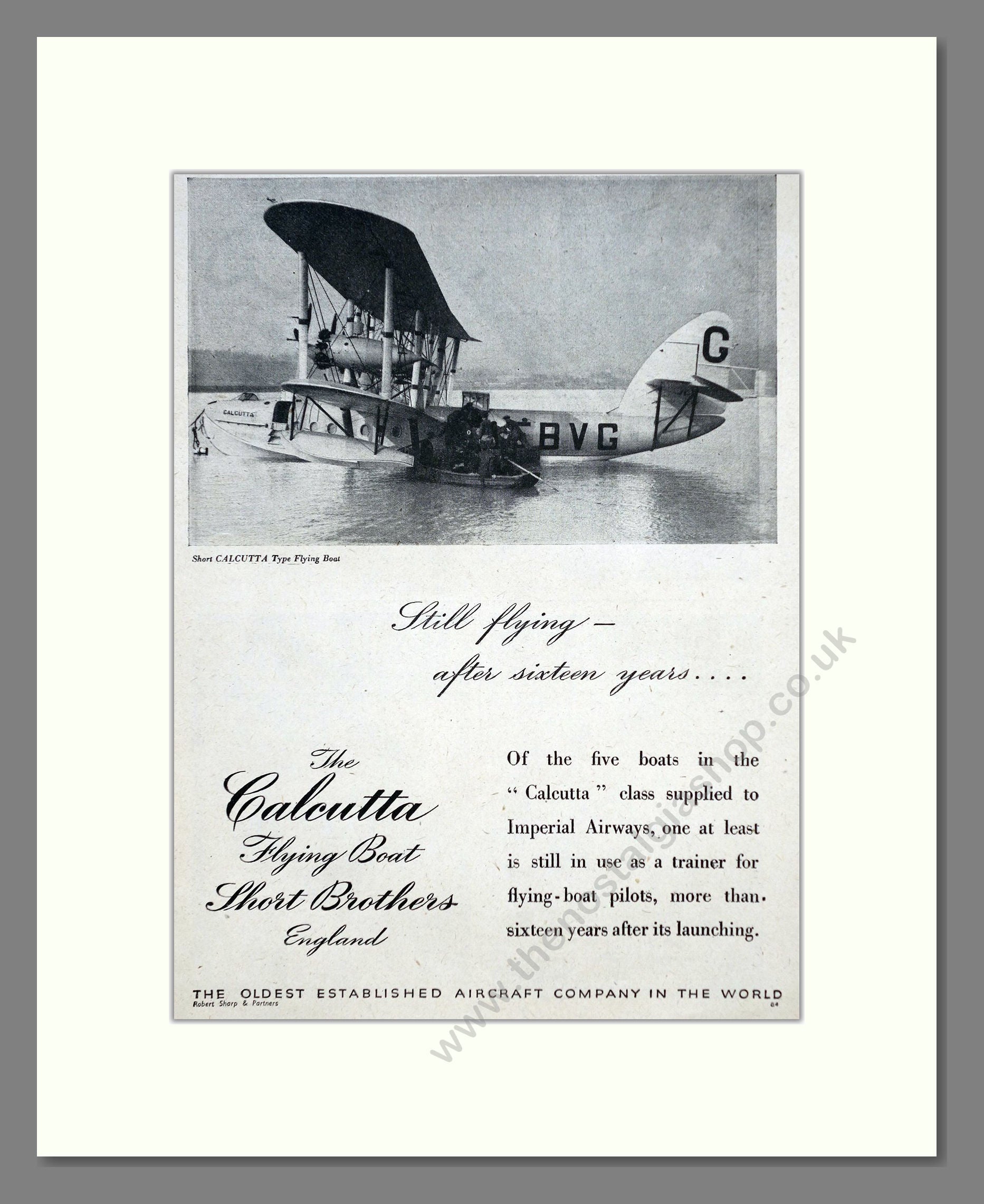 Short Bros Ltd - Calcutta Flying Boat. Vintage Advert. This is a classic original advert from 1945. Presented and supplied in a cream bevel cut mount with backing card and clear bag. Ready to fit in a 14 x 11 inches frame. The mounted advert will be posted via courier and well packed - protected with a sheet of hardboard to keep it rigid. Any questions or enquiries, please get in touch, we are here to help! All our adverts, unless clearly stated are originals from the date shown. They make excellent pieces of wall art and stunning gifts. Many are rare and hard to find and once sold, may not be replaced. Remember you are buying a piece of history. Website watermark is not on original.