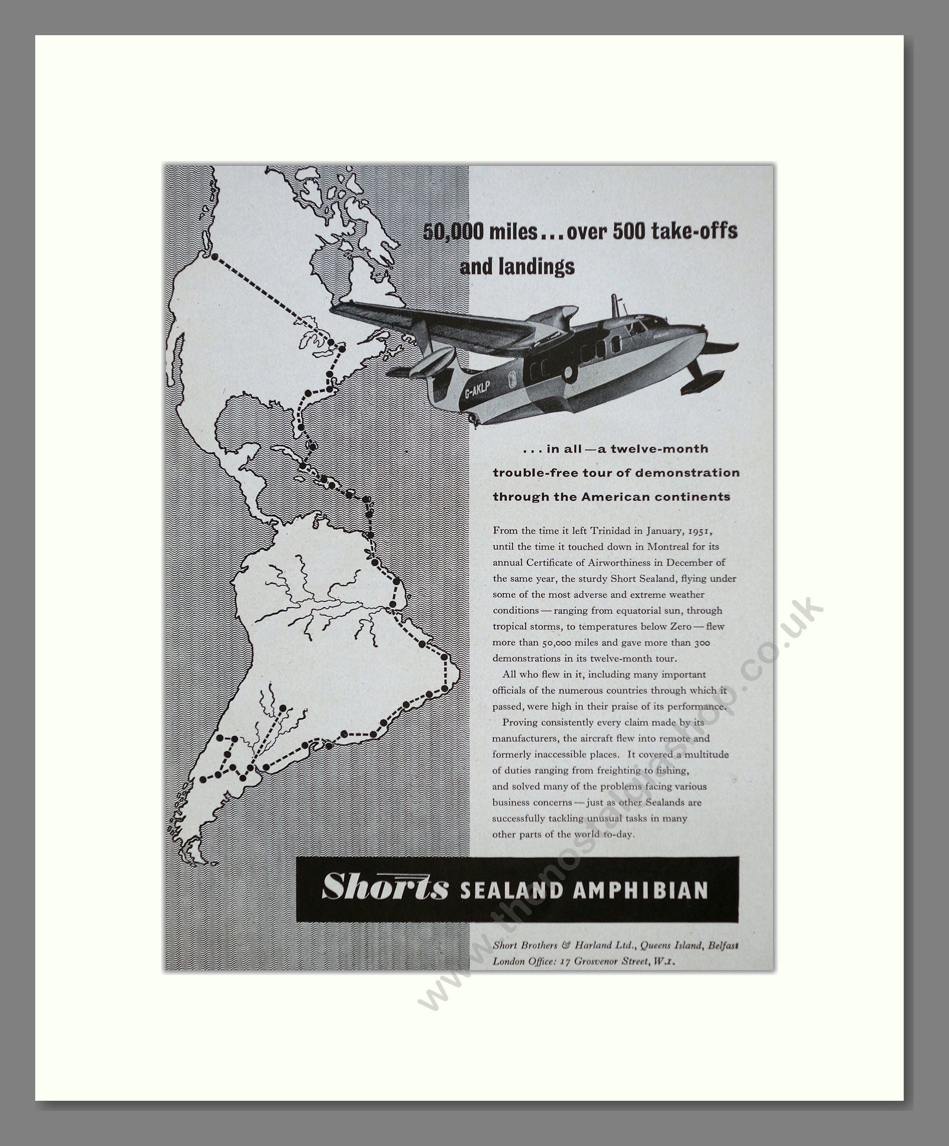 Short Bros Ltd - Sealand Amphibian. Vintage Advert. This is a classic original advert from 1952. Presented and supplied in a cream bevel cut mount with backing card and clear bag. Ready to fit in a 14 x 11 inches frame. The mounted advert will be posted via courier and well packed - protected with a sheet of hardboard to keep it rigid. Any questions or enquiries, please get in touch, we are here to help! All our adverts, unless clearly stated are originals from the date shown. They make excellent pieces of wall art and stunning gifts. Many are rare and hard to find and once sold, may not be replaced. Remember you are buying a piece of history. Website watermark is not on original.