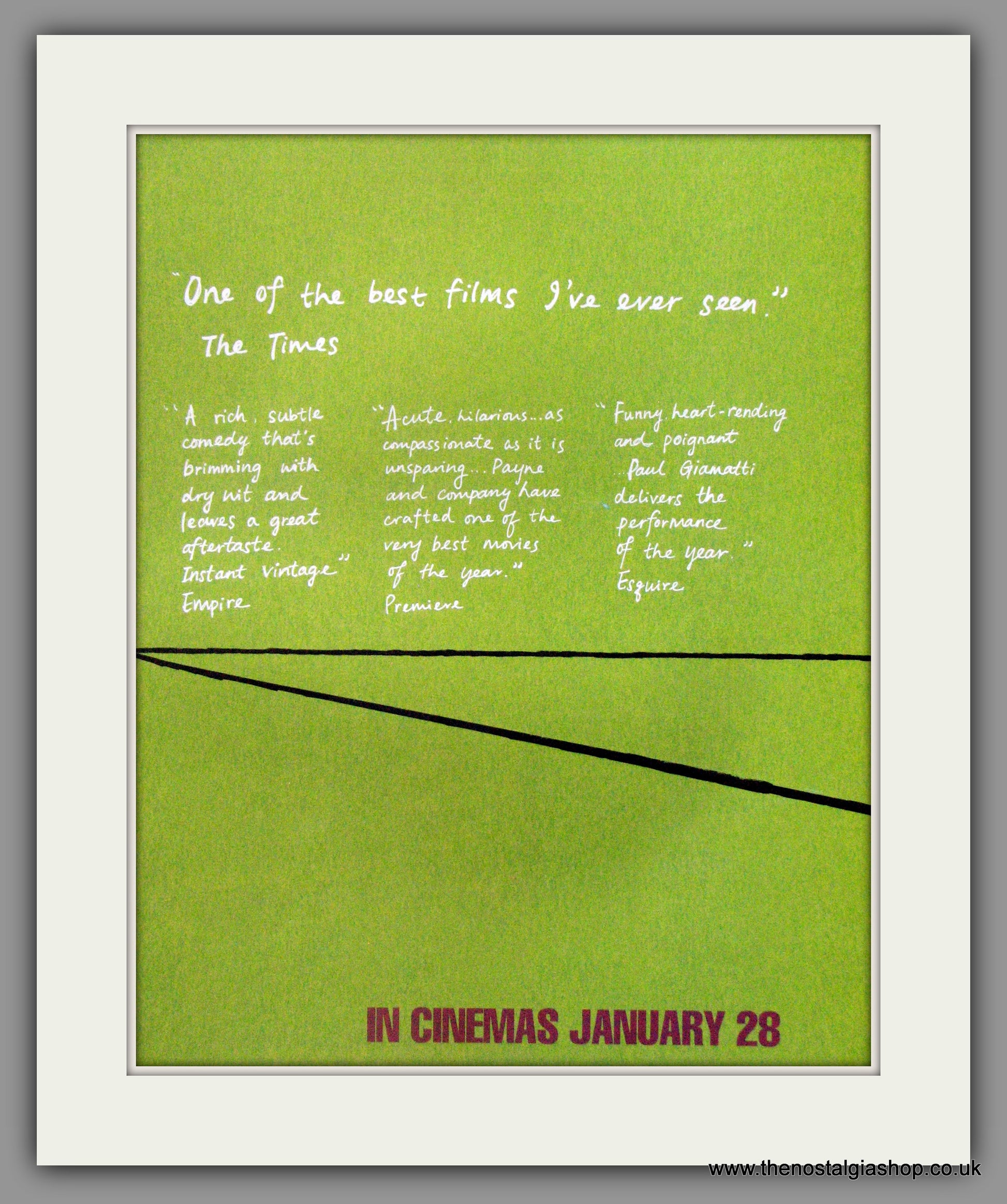 Sideways-Paul Giamatti, Thomas Haden Church. Classic Original adverts 2005. Presented in cream bevel cut mount with backing card and clear bag. Each is ready to fit in 14 x 11 inch frames. Want them framing? If so, buy this then go to Frames Available Category. Click to buy on the suitable frame and we will do the rest. All our adverts, unless clearly stated are Originals from the date shown. They make excellent pieces of wall art and stunning gifts. Many are rare and hard to find and once sold, may not be replaced. Remember you are buying a piece of history. Website watermark is not on original.