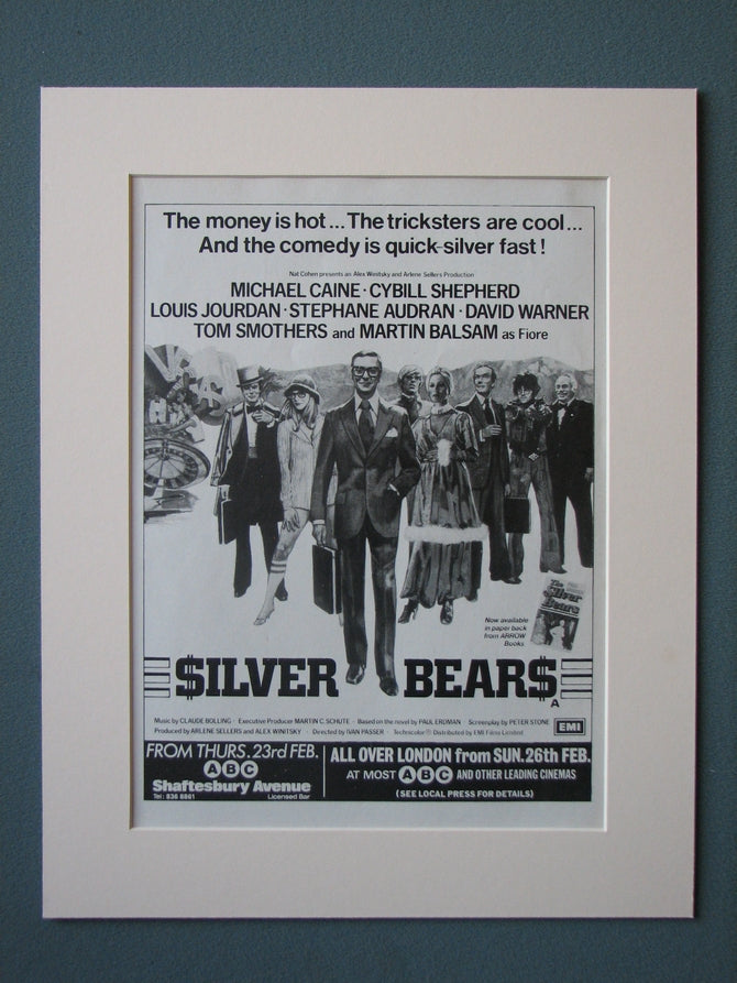 Silver Bears. Michael Caine, Cybill Shepherd. Original advert 1978 Presented in cream bevel cut mount with backing card. Ready to fit in 14 x 11 inch frame. Want it framing? buy this then go to Frames Available Category click to buy on the suitable frame and we will do the rest. All our adverts unless clearly stated are Originals from the date shown. They make excellent pieces of wall art and stunning gifts. Many are rare and hard to find and once sold, may not be replaced. Remember you are buying a piece of history