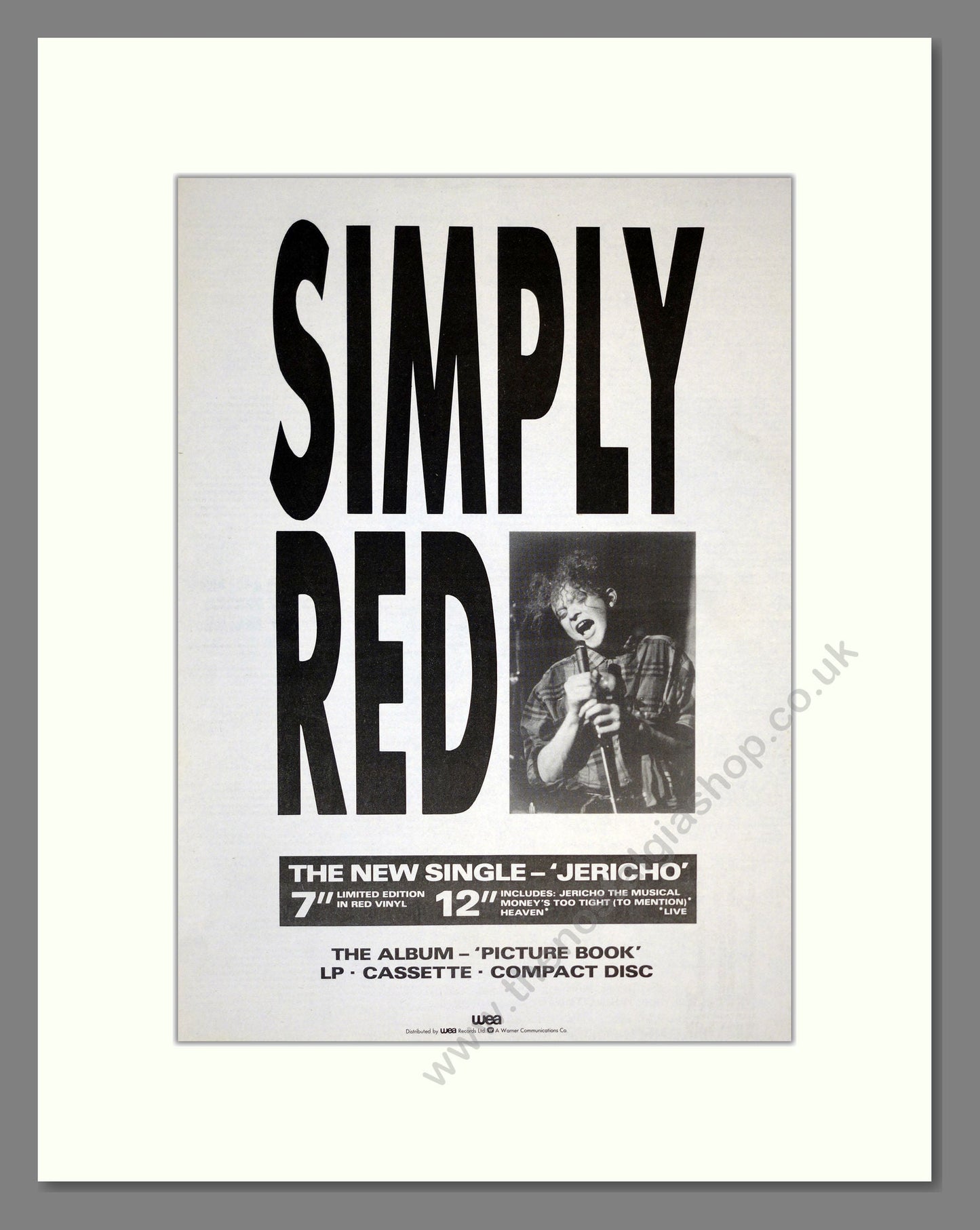 Simply Red - Jericho. Vintage Advert. This is a large classic original advert from 1986. Presented and supplied in a cream bevel cut mount with backing card and clear bag. Ready to fit in a 20 x 16 inches frame. The mounted advert will be posted via courier and well packed - protected with a sheet of hardboard to keep it rigid. Any questions or enquiries, please get in touch, we are here to help! All our adverts, unless clearly stated are originals from the date shown. They make excellent pieces of wall art and stunning gifts. Many are rare and hard to find and once sold, may not be replaced. Remember you are buying a piece of history. Website watermark is not on original.