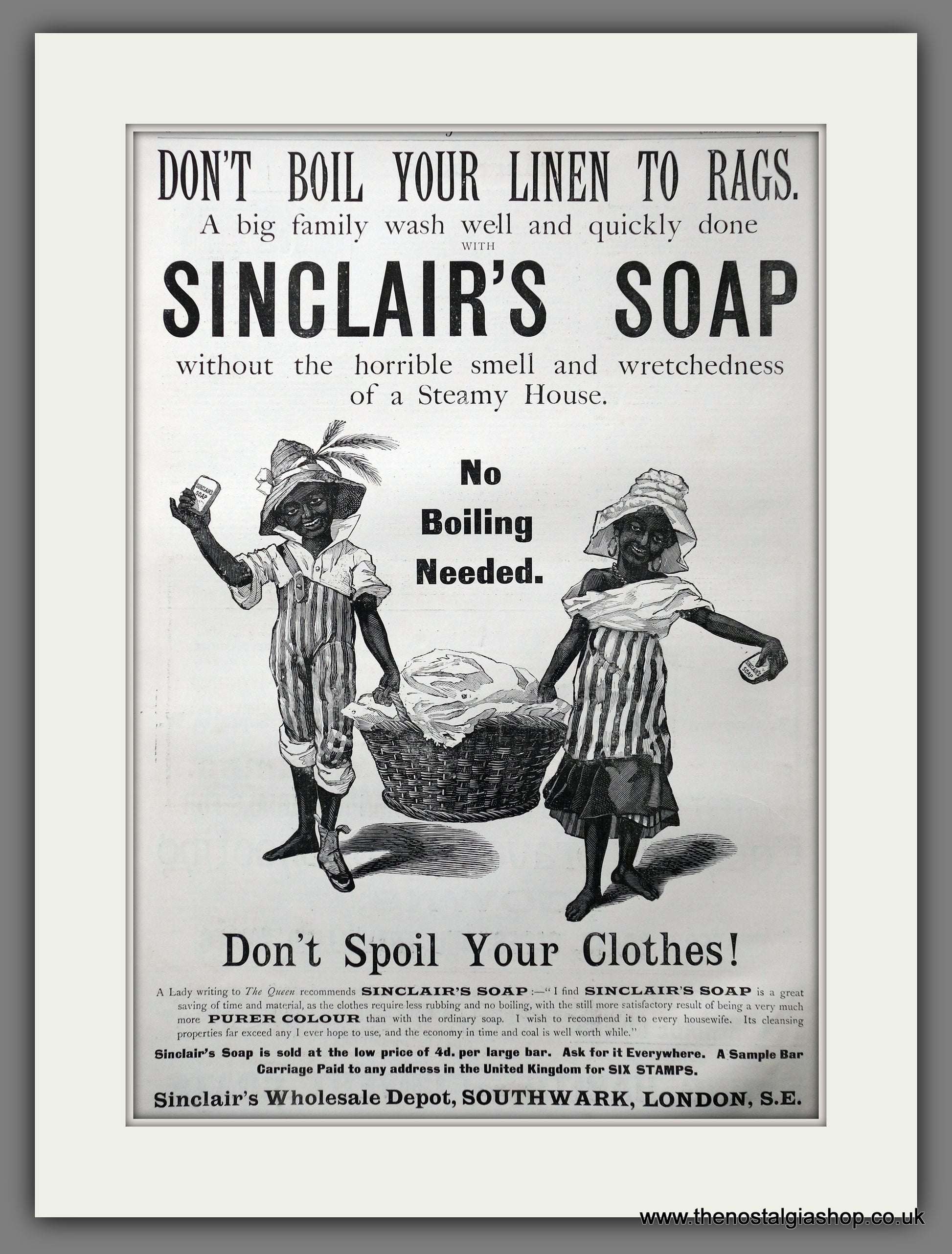 Sinclair's Soap. Classic Original Advert 1891. Presented and Supplied in a Cream Mount, backing board and clear bag, size 18 x 14 Inches. Item will be well packed with a sheet of hardboard to prevent damage. All our adverts, unless clearly stated are Originals from the date shown They make excellent pieces of wall art and stunning gifts. Many are rare and hard to find and once sold, may not be replaced. Remember you are buying a piece of history. Website watermark is not on original.