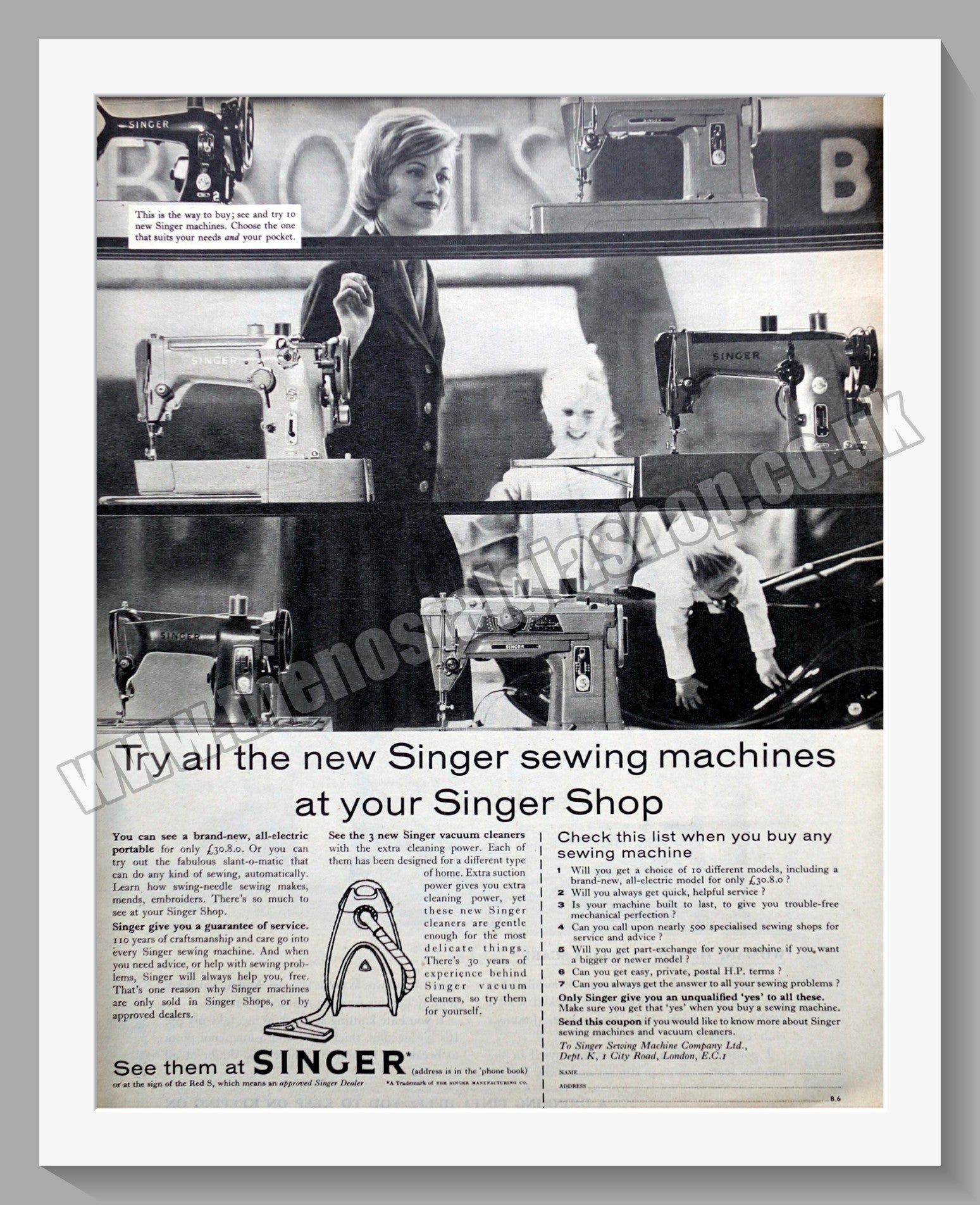 Singer Sewing Machine. Classic original advert 1961. Presented and Supplied in cream bevel cut mount with backing card and clear bag. Ready to fit in 18 x 14 inch frame. All our adverts, unless clearly stated are Originals from the date shown They make excellent pieces of wall art and stunning gifts. Many are rare and hard to find and once sold, may not be replaced. Remember you are buying a piece of history. Website watermark is not on original. Sewing Machine Adverts. Vintage Sewing Machines.