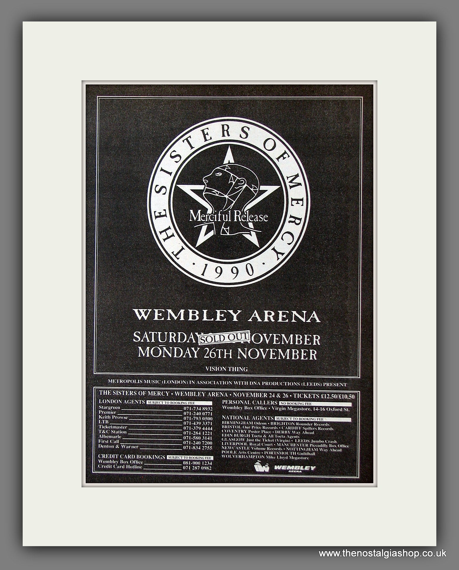 The Sisters Of Mercy In Concert Wembley. Classic Original advert 1990. Presented and supplied in a cream bevel cut mount with backing card and clear bag. Ready to fit in 14 x 11 inch frame. The mounted advert will be posted via courier and well packed - protected with a sheet of hardboard to keep it rigid. Any questions or inquiries, please get in touch, we are here to help! All our adverts, unless clearly stated are Originals from the date shown. They make excellent pieces of wall art and stunning gifts. Many are rare and hard to find and once sold, may not be replaced. Remember you are buying a piece of history. Website watermark is not on original.