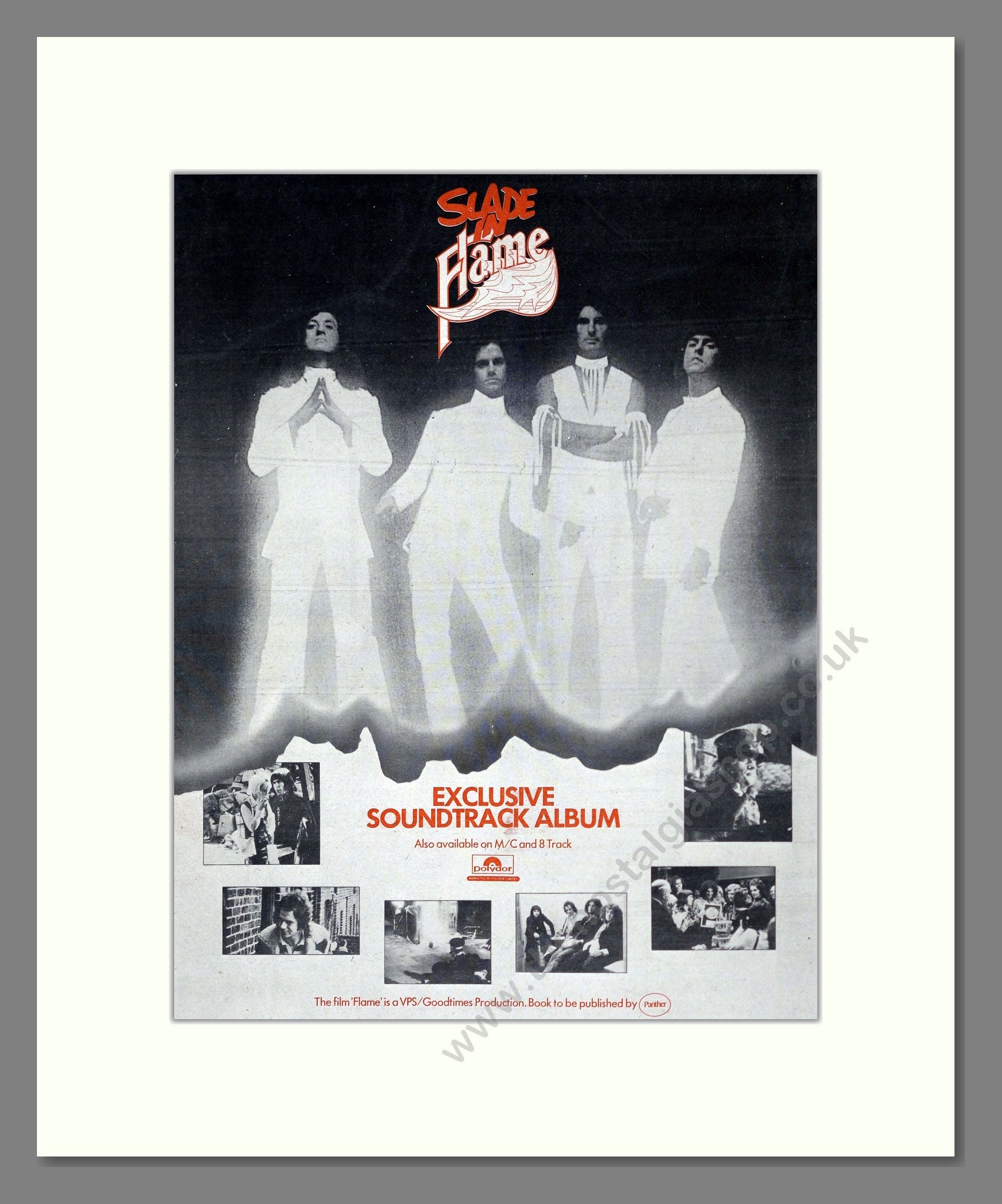 Slade - Slade In Flame. Vintage Advert. This is a large classic original advert from 1974. Presented and supplied in a cream bevel cut mount with backing card and clear bag. Ready to fit in a 20 x 16 inches frame. The mounted advert will be posted via courier and well packed - protected with a sheet of hardboard to keep it rigid. Any questions or enquiries, please get in touch, we are here to help! All our adverts, unless clearly stated are originals from the date shown. They make excellent pieces of wall art and stunning gifts. Many are rare and hard to find and once sold, may not be replaced. Remember you are buying a piece of history. Website watermark is not on original.