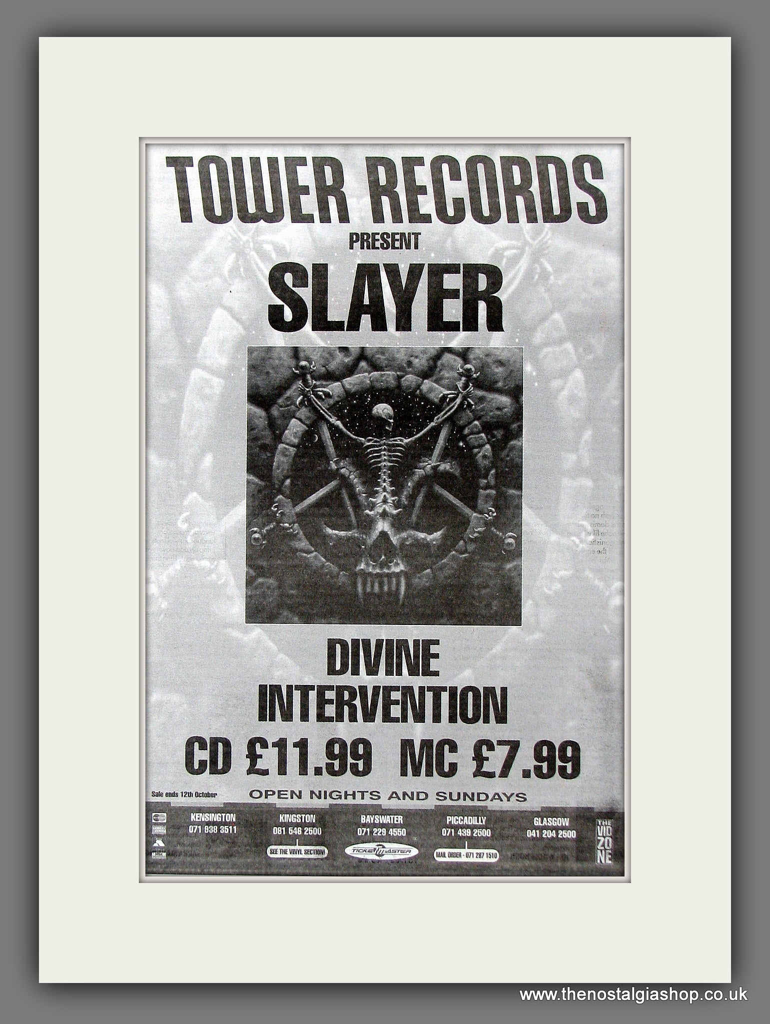 Slayer Divine Intervention. Classic Original advert 1994. Presented and supplied in a cream bevel cut mount with backing card and clear bag. Ready to fit in 14 x 11 inch frame. The mounted advert will be posted via courier and well packed - protected with a sheet of hardboard to keep it rigid. Any questions or inquiries, please get in touch, we are here to help! All our adverts, unless clearly stated are Originals from the date shown. They make excellent pieces of wall art and stunning gifts. Many are rare and hard to find and once sold, may not be replaced. Remember you are buying a piece of history. Website watermark is not on original.