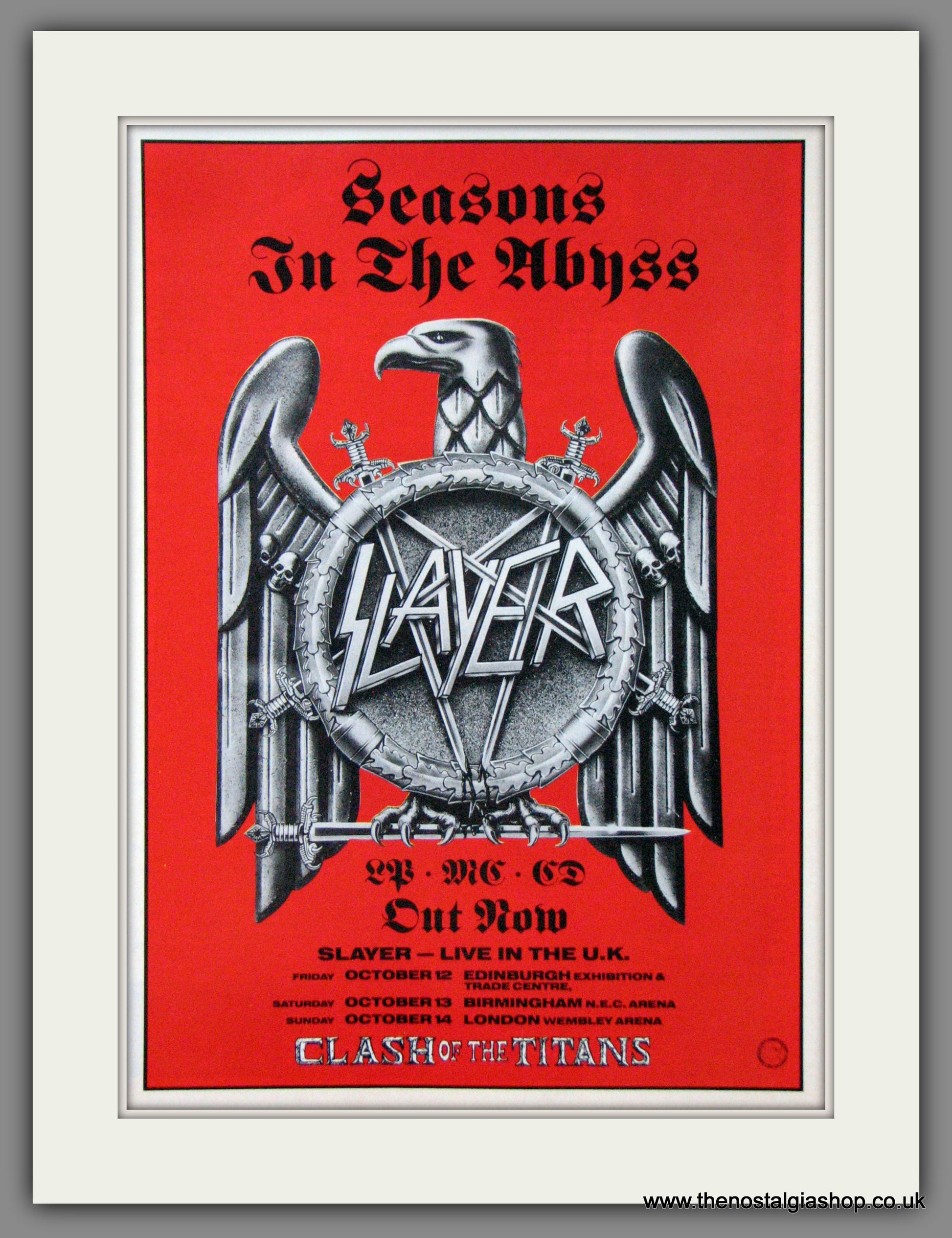 Slayer. Seasons In The Abyss. Classic Original advert 1990. Presented and Supplied in a cream bevel cut mount with backing card and clear bag. Ready to fit in 14 x 11 inch frame. Want it framing? If so, buy this then go to Frames Available Category. Click to buy on the suitable frame and we will do the rest. All our adverts, unless clearly stated are Originals from the date shown. They make excellent pieces of wall art and stunning gifts. Many are rare and hard to find and once sold, may not be replaced. Remember you are buying a piece of history. Website watermark is not on original.