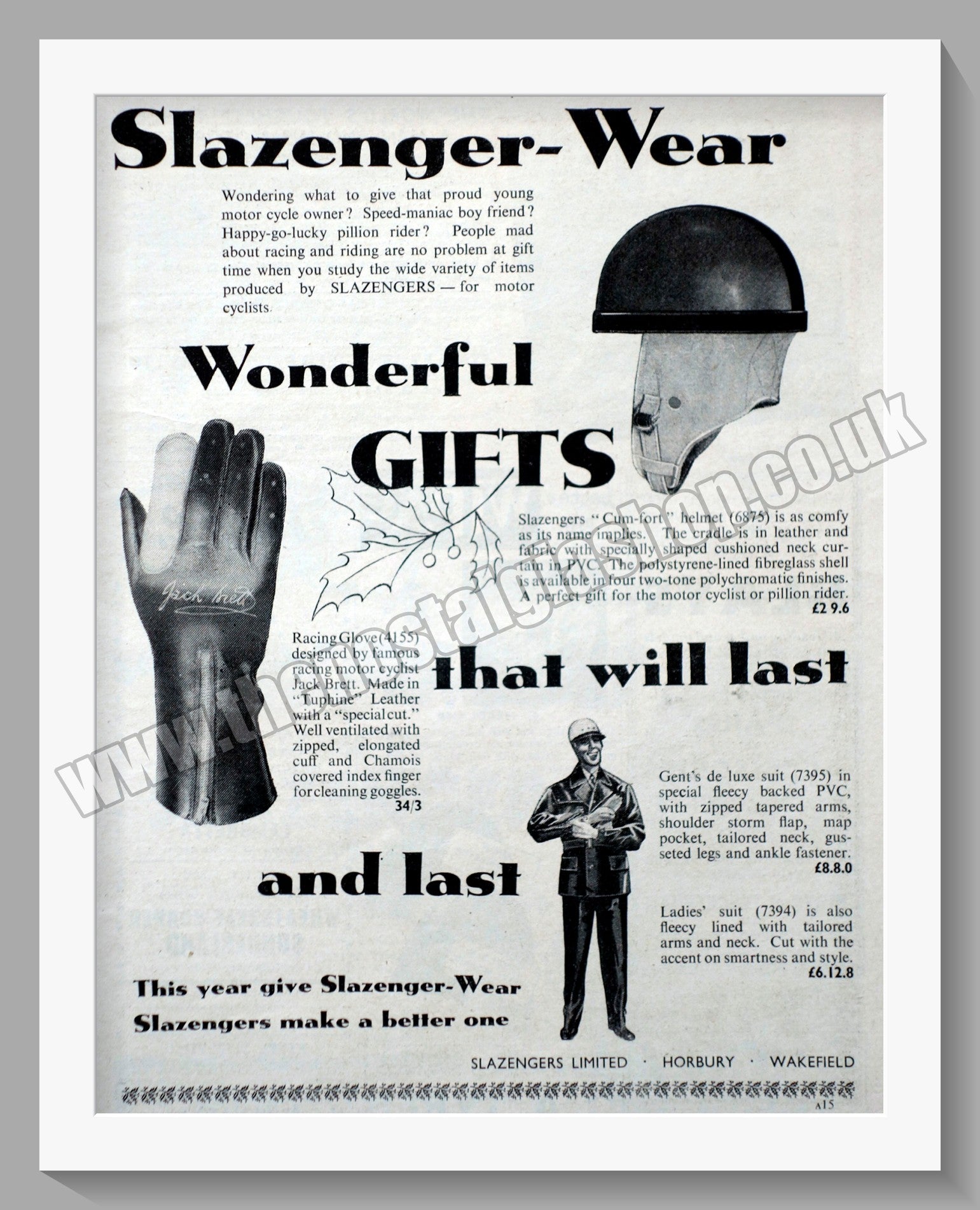 Slazenger Motor Cycle Clothing. Original Advert 1959. Presented and Supplied in 14 x 11 Inch, cream bevel cut mount with backing card and Clear bag. Ready to frame. All our adverts, unless clearly stated are Originals from the date shown They make excellent pieces of wall art and stunning gifts. Many are rare and hard to find and once sold, may not be replaced. Remember you are buying a piece of history. Website watermark is not on original. Vintage Motorcycle Clothing, Vintage Motorcycle Leathers.