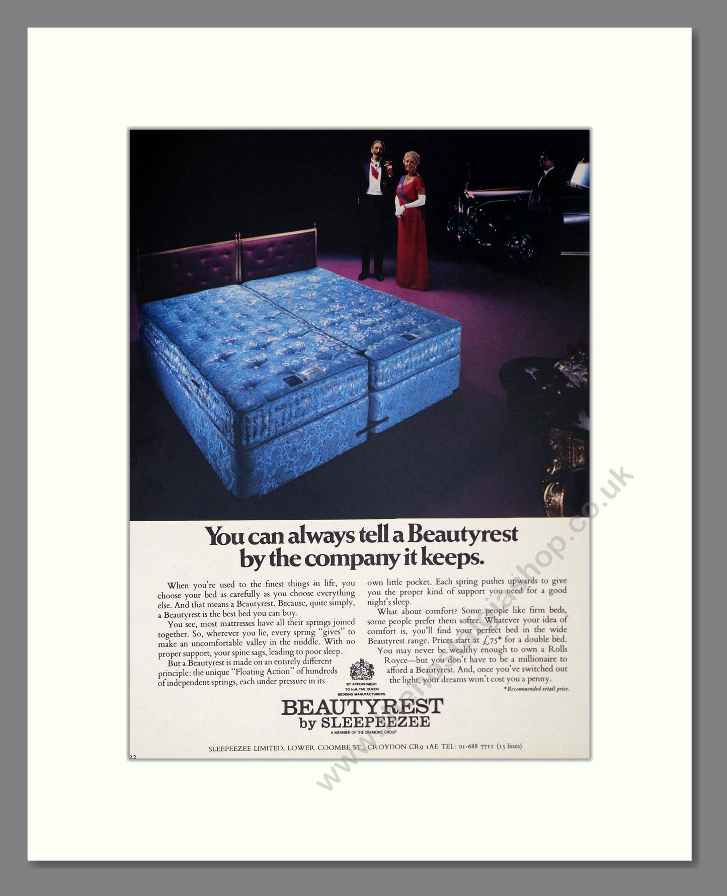 Sleepeezee - Beautyrest Mattress. Vintage Advert. This is a large classic original advert from 1971. Presented and supplied in a cream bevel cut mount with backing card and clear bag. Ready to fit in a 18 x 14 inches frame. The mounted advert will be posted via courier and well packed - protected with a sheet of hardboard to keep it rigid. Any questions or enquiries, please get in touch, we are here to help! All our adverts, unless clearly stated are originals from the date shown. They make excellent pieces of wall art and stunning gifts. Many are rare and hard to find and once sold, may not be replaced. Remember you are buying a piece of history. Website watermark is not on original.