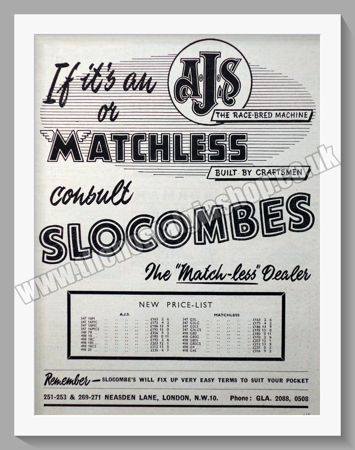 Slocombes. Neasden Lane, London. Motor Cycle Dealers. Classic Original advert 1953. Presented and Supplied in a 14 x 11 Inch, cream bevel cut mount with backing card and clear bag. Ready to frame. All our adverts, unless clearly stated are Originals from the date shown They make excellent pieces of wall art and stunning gifts. Many are rare and hard to find and once sold, may not be replaced. Remember you are buying a piece of history. Website watermark is not on original. Motor Cycle Dealers, Motor Cycle Dealerships, Vintage Motorcycles.