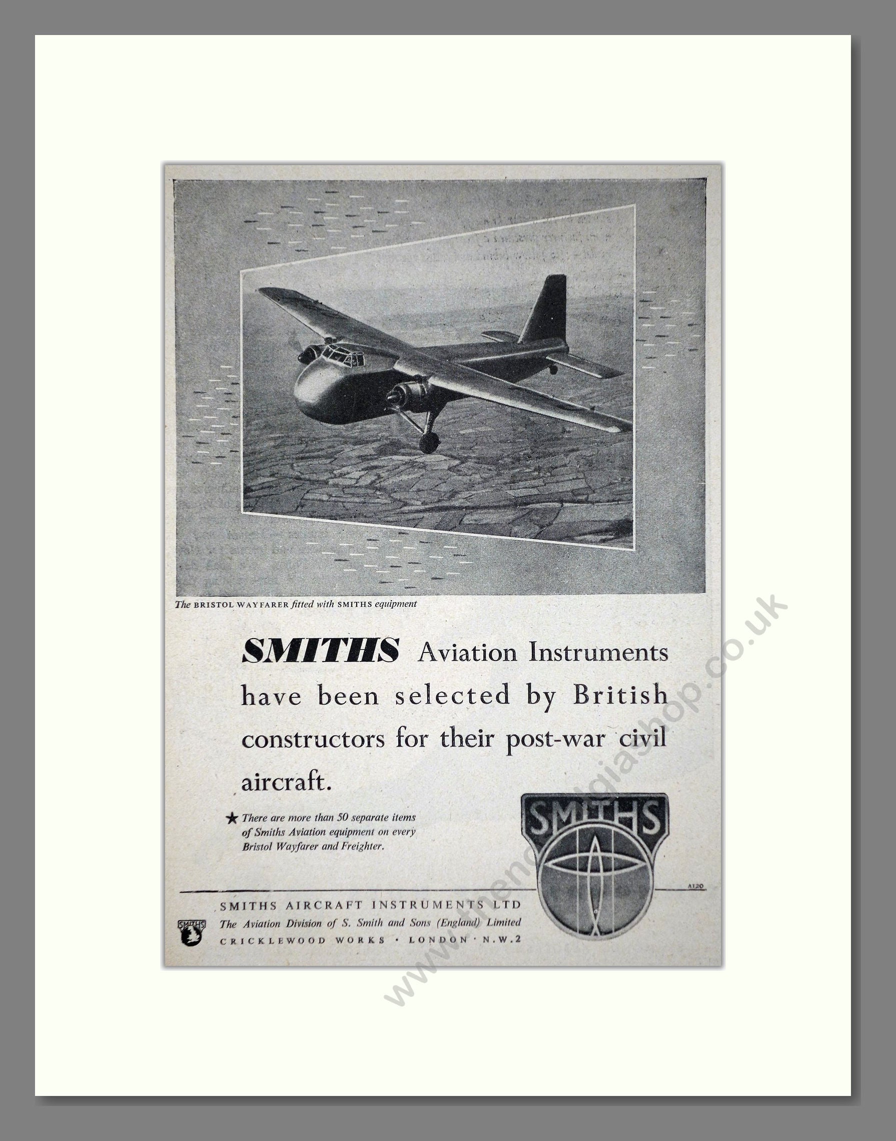 Smiths - Aviation Instruments. Vintage Advert. This is a classic original advert from 1947. Presented and supplied in a cream bevel cut mount with backing card and clear bag. Ready to fit in a 14 x 11 inches frame. The mounted advert will be posted via courier and well packed - protected with a sheet of hardboard to keep it rigid. Any questions or enquiries, please get in touch, we are here to help! All our adverts, unless clearly stated are originals from the date shown. They make excellent pieces of wall art and stunning gifts. Many are rare and hard to find and once sold, may not be replaced. Remember you are buying a piece of history. Website watermark is not on original.