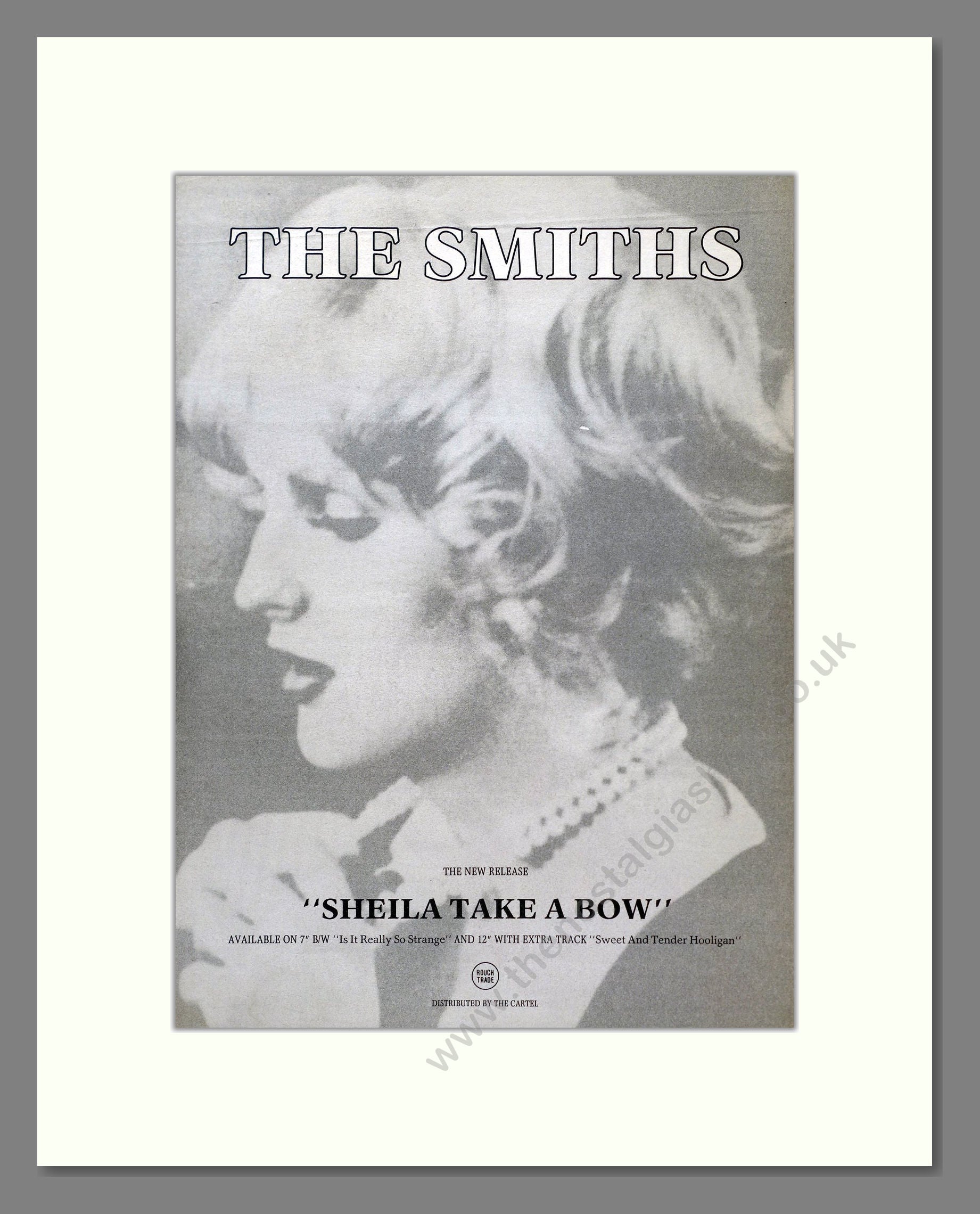 Smiths (The) - Sheila Take A Bow. Vintage Advert. This is a large classic original advert from 1987. Presented and supplied in a cream bevel cut mount with backing card and clear bag. Ready to fit in a 20 x 16 inches frame. The mounted advert will be posted via courier and well packed - protected with a sheet of hardboard to keep it rigid. Any questions or enquiries, please get in touch, we are here to help! All our adverts, unless clearly stated are originals from the date shown. They make excellent pieces of wall art and stunning gifts. Many are rare and hard to find and once sold, may not be replaced. Remember you are buying a piece of history. Website watermark is not on original.