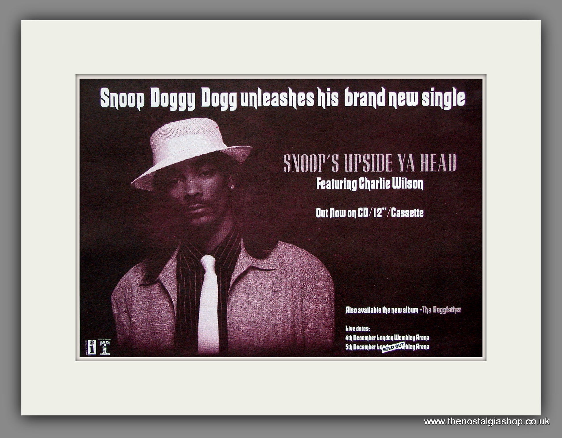 Snoop Dog, Snoop's Upside Your Head. Classic Original advert 1996. Presented and supplied in a cream bevel cut mount with backing card and clear bag. Ready to fit in 14 x 11 inch frame. The mounted advert will be posted via courier and well packed - protected with a sheet of hardboard to keep it rigid. Any questions or inquiries, please get in touch, we are here to help! All our adverts, unless clearly stated are Originals from the date shown. They make excellent pieces of wall art and stunning gifts. Many are rare and hard to find and once sold, may not be replaced. Remember you are buying a piece of history. Website watermark is not on original.