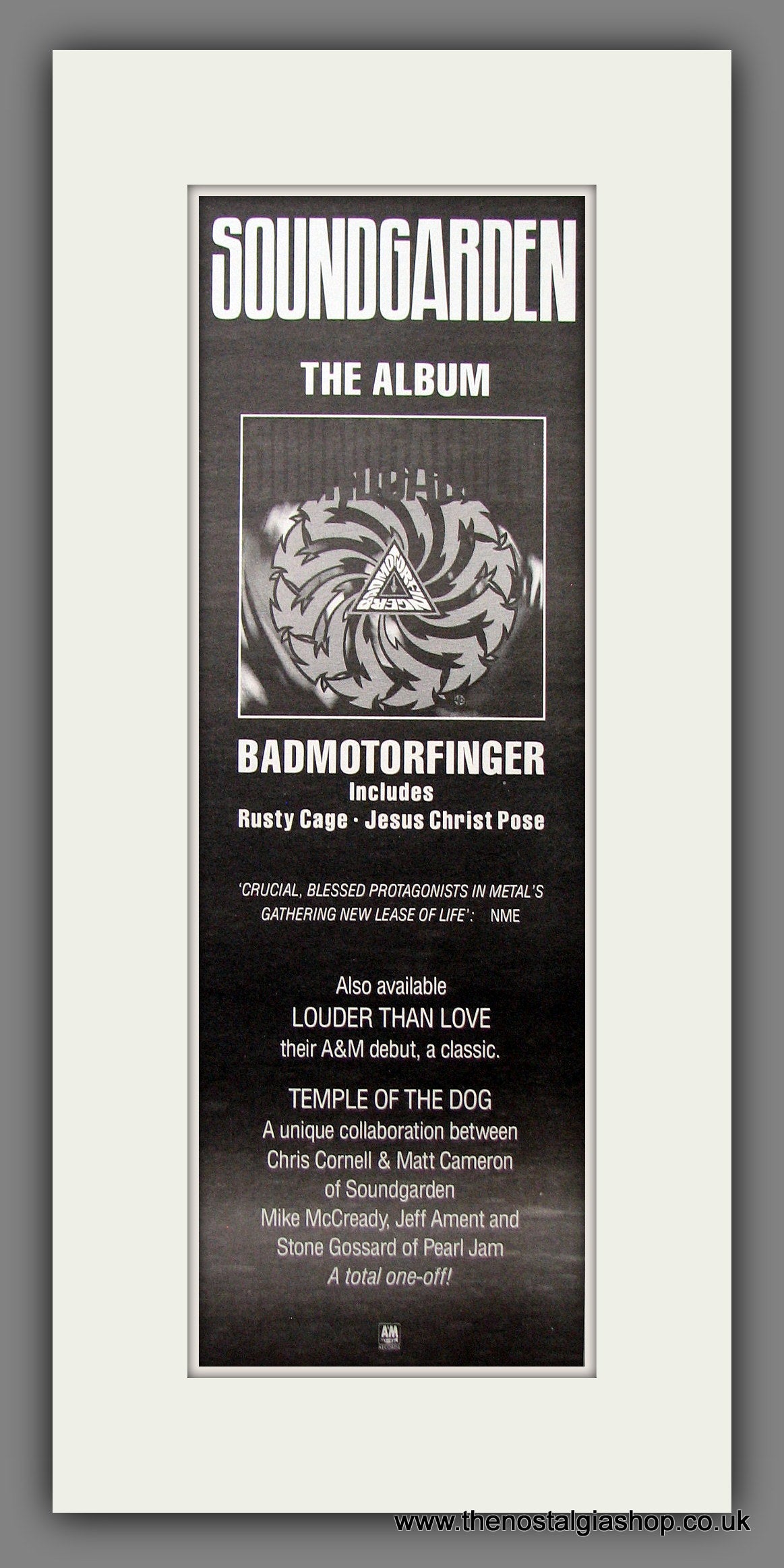 Soundgarden Badmotorfinger. This is a large Original Vintage Advert 1992. Presented and Supplied in a cream, bevel cut mount with backing card and clear bag. Ready to fit in 20 x 10 inch frame. The mounted advert will be posted via courier and well packed - protected with a sheet of hardboard to keep it rigid. Any questions or inquiries, please get in touch, we are here to help! All our adverts, unless clearly stated are Originals from the date shown. They make excellent pieces of wall art and stunning gifts. Many are rare and hard to find and once sold, may not be replaced. Remember you are buying a piece of history. Website watermark is not on original.