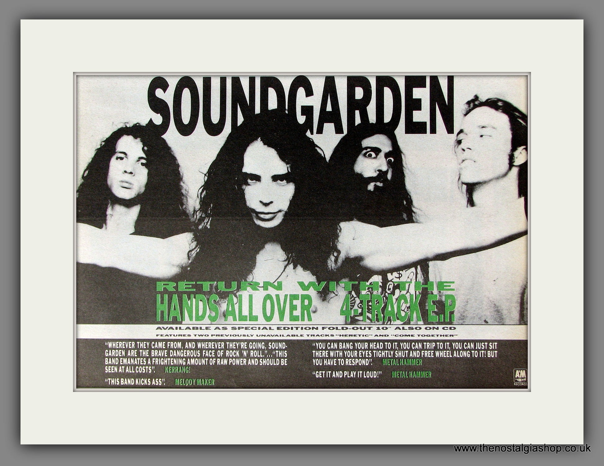 Soundgarden. Hands All Over. Vintage Advert. Classic Original Advert 1990. Presented and Supplied in a cream bevel cut mount with backing card and display bag. Ready to fit in 14 x 11 inch frame. Want it framing? If so, buy this then go to Frames Available Category. Click to buy on the suitable frame and we will do the rest. All our adverts, unless clearly stated are Originals from the date shown. They make excellent pieces of wall art and stunning gifts. Many are rare and hard to find and once sold, may not be replaced. Remember you are buying a piece of history. Website watermark is not on original.