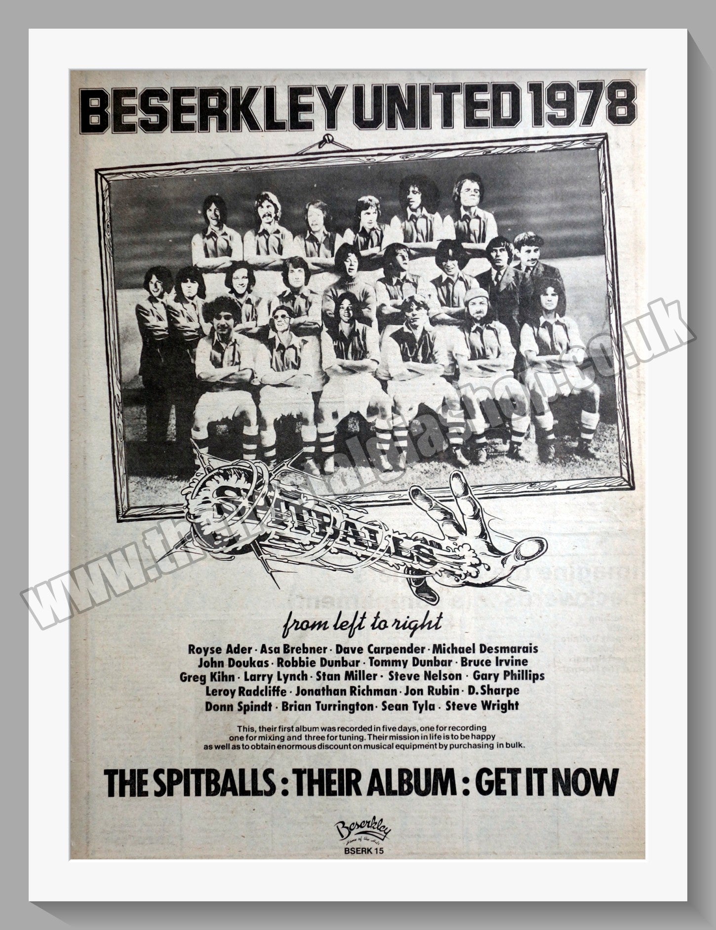 The Spitballs Beserkley United. Large original advert 1978. Presented and Supplied in cream bevel cut mount with backing card and clear bag. Ready to fit in 20 x 16 inch frame. All our adverts, unless clearly stated are Originals from the date shown. They make excellent pieces of wall art and stunning gifts. Many are rare and hard to find and once sold, may not be replaced. Remember you are buying a piece of history. Website watermark is not on original.