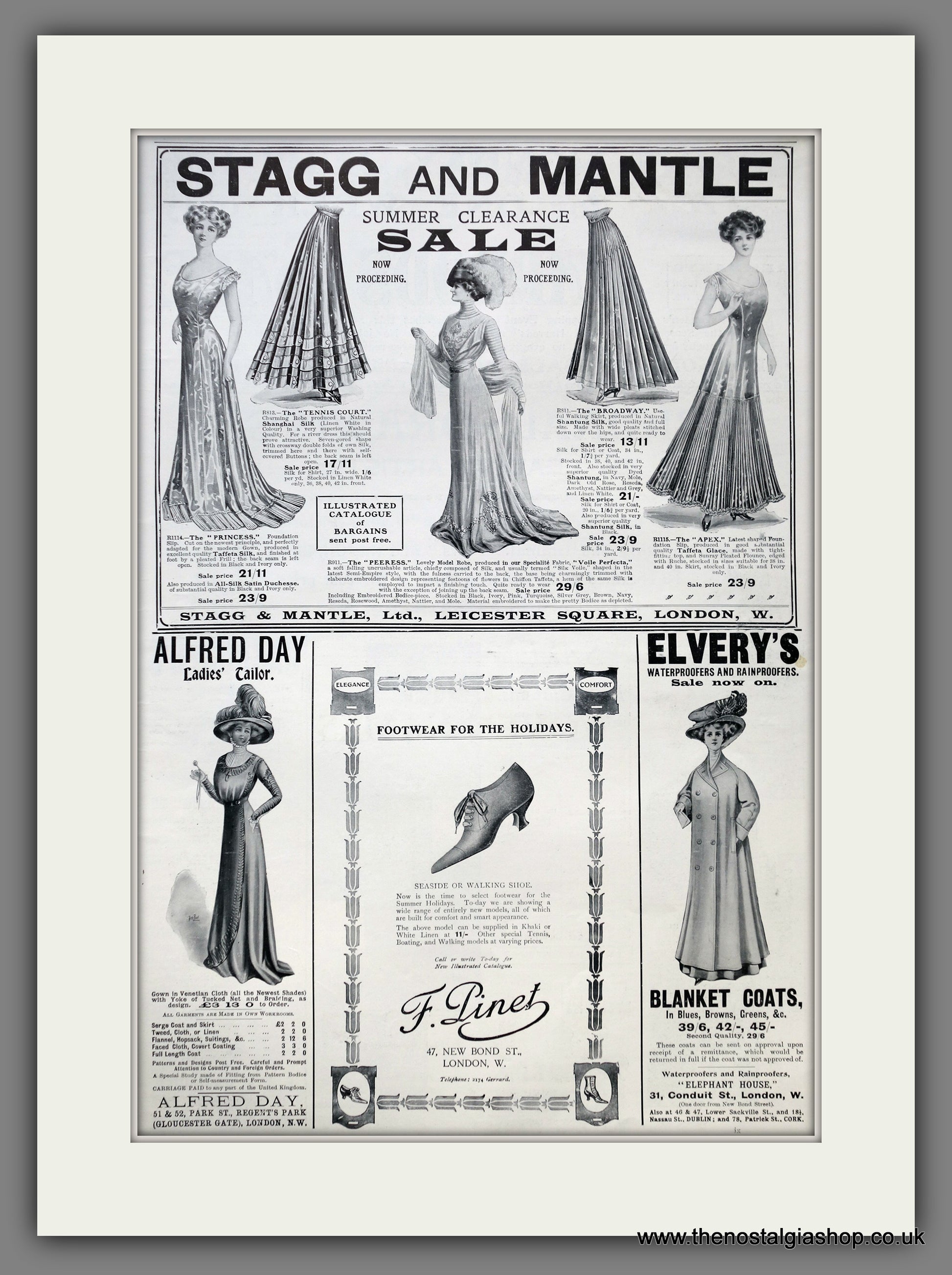 Stagg & Mantle Ladies Clothing. This is a large Original advert 1909. Presented in a 20 x 16 Inch, cream bevel cut mount with backing card and clear bag. The mounted advert will be posted via courier and well packed - protected with a sheet of hardboard to keep it rigid. Any questions or enquiries, please get in touch, we are here to help! All our adverts, unless clearly stated are Originals from the date shown. They make excellent pieces of wall art and stunning gifts. Many are rare and hard to find and once sold, may not be replaced. Remember you are buying a piece of history. Website watermark is not on original.
