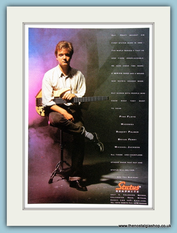 Status Bass Guitars. Featuring Guy Pratt from Pink Floyd. Classic original advert 1990. Professionally sealed and presented in cream bevel cut mount with backing card. Ready to fit in 14 x 11 inch frame. Want it framing? If so, buy this then go to Frames Available Catagory. Click to buy on the suitable frame and we will do the rest. All our adverts, unless clearly stated are Originals from the date shown. They make excellent pieces of wall art and stunning gifts. Many are rare and hard to find and once sold, may not be replaced. Remember you are buying a piece of history. Website watermark is not on original.