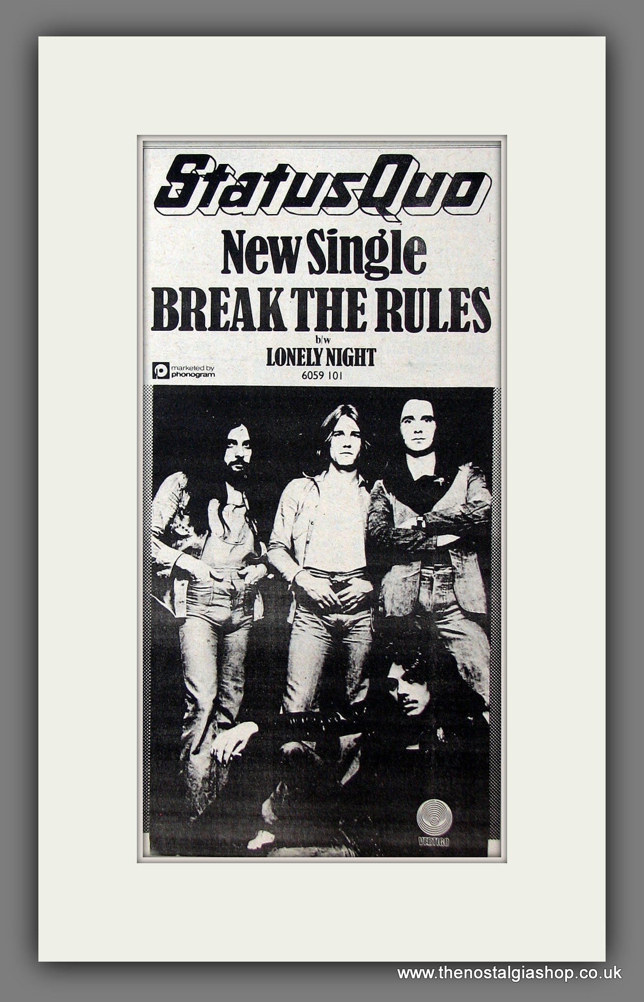Status Quo Break The Rules. Classic Original advert 1974. Presented and supplied in a cream bevel cut mount with backing card and clear bag. Ready to fit in 14 x 11 inch frame. The mounted advert will be posted via courier and well packed - protected with a sheet of hardboard to keep it rigid. Any questions or inquiries, please get in touch, we are here to help! All our adverts, unless clearly stated are Originals from the date shown. They make excellent pieces of wall art and stunning gifts. Many are rare and hard to find and once sold, may not be replaced. Remember you are buying a piece of history. Website watermark is not on original.