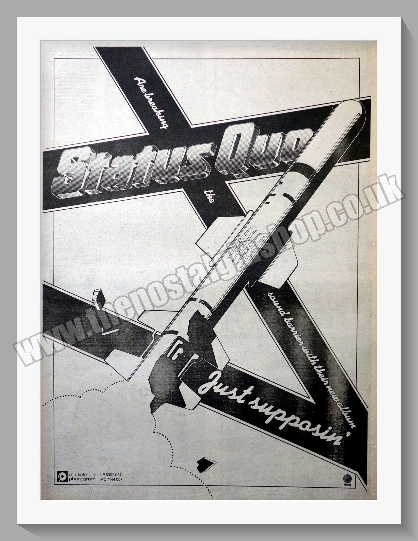 Status Quo Just Supposin'. Vintage Advert. This is a large Original advert 1980. Presented and Supplied in a 20 x 16 Inch, cream bevel cut mount with backing card and clear bag. Ready to frame. The mounted advert will be posted via courier and well packed - protected with a sheet of hardboard to keep it rigid. Any questions or inquiries, please get in touch, we are here to help! All our adverts, unless clearly stated are Originals from the date shown. They make excellent pieces of wall art and stunning gifts. Many are rare and hard to find and once sold, may not be replaced. Remember you are buying a piece of history. Website watermark is not on original.